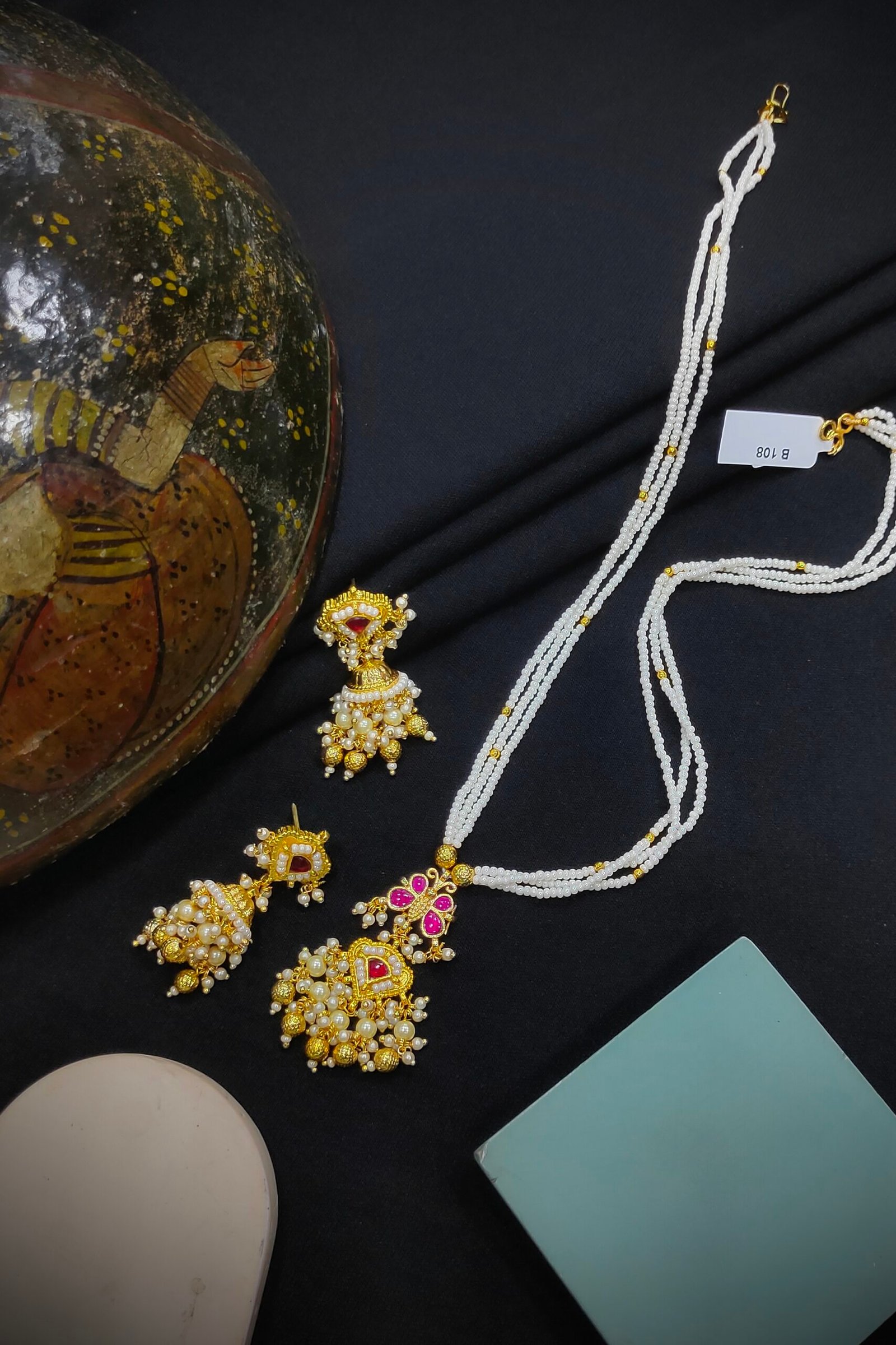 “Elegant and traditional, Pachi Kundan pendant sets feature intricate handcrafted designs adorned with vibrant gemstones and rich enamel work. Perfect for festive occasions and weddings, these sets add a royal charm to any outfit.”