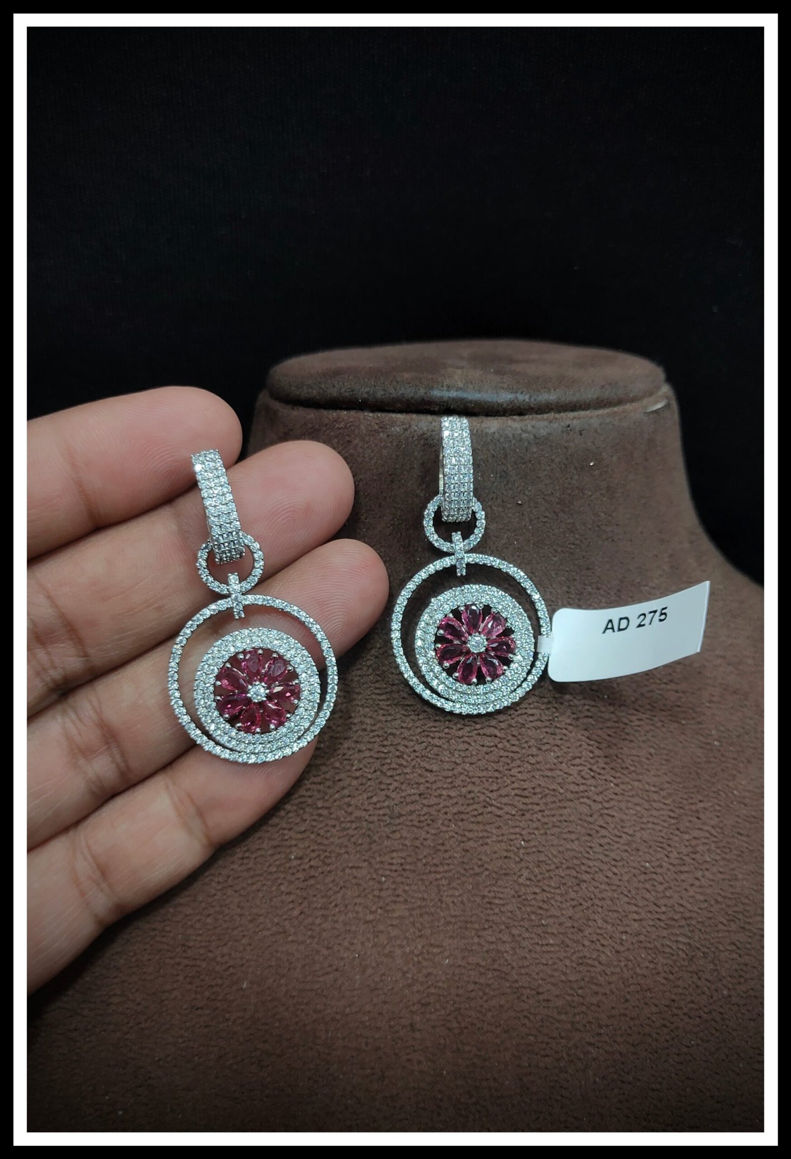 Explore our exquisite AD Earrings, crafted to dazzle and delight. Featuring shimmering American Diamonds set in a blend of brass and copper, these earrings ensure both durability and elegance. Choose from a range of luxurious platings including Silver, Gold, Rose Gold, Victoria, and Silver+Gold to match your unique style. Elevate any look with the timeless sparkle of our AD Earrings, perfect for adding glamour to every occasion. Experience luxury redefined with our meticulously crafted pieces