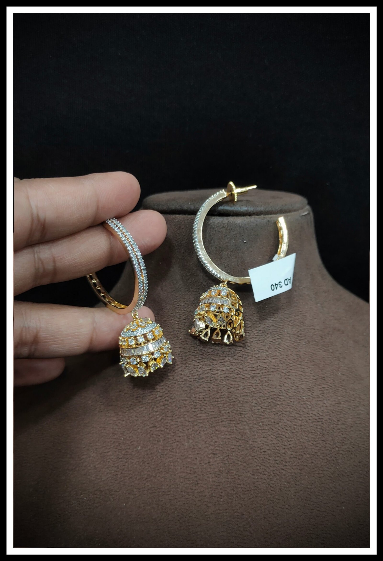 Explore our exquisite AD Earrings, crafted to dazzle and delight. Featuring shimmering American Diamonds set in a blend of brass and copper, these earrings ensure both durability and elegance. Choose from a range of luxurious platings including Silver, Gold, Rose Gold, Victoria, and Silver+Gold to match your unique style. Elevate any look with the timeless sparkle of our AD Earrings, perfect for adding glamour to every occasion. Experience luxury redefined with our meticulously crafted pieces