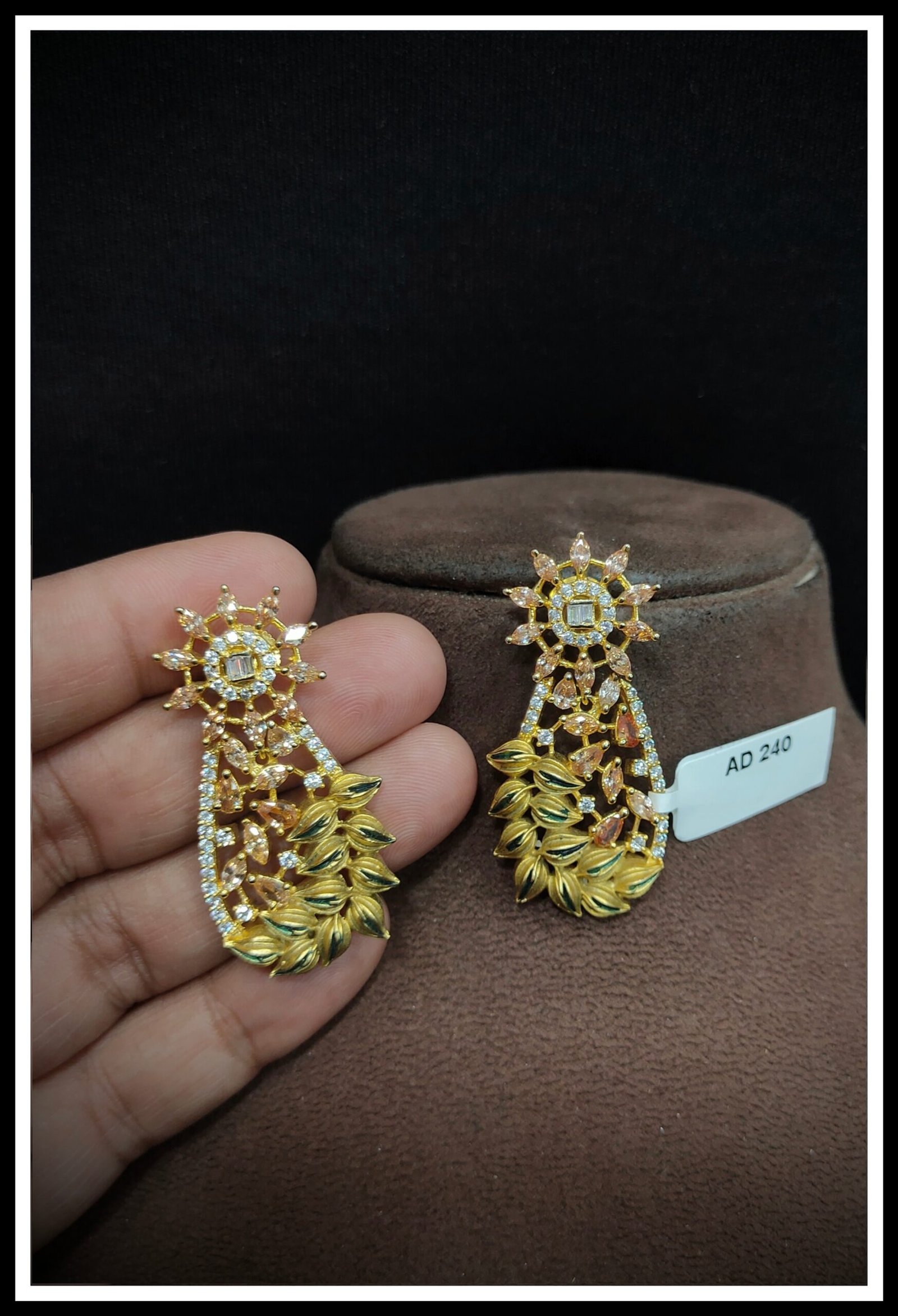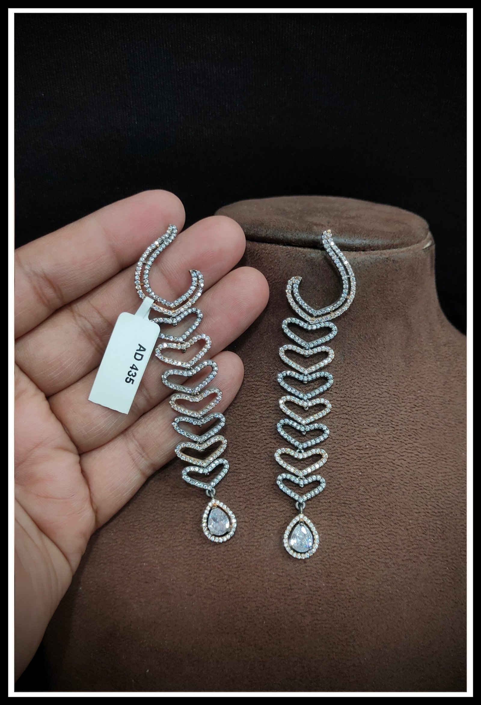 Explore our exquisite AD Earrings, crafted to dazzle and delight. Featuring shimmering American Diamonds set in a blend of brass and copper, these earrings ensure both durability and elegance. Choose from a range of luxurious platings including Silver, Gold, Rose Gold, Victoria, and Silver+Gold to match your unique style. Elevate any look with the timeless sparkle of our AD Earrings, perfect for adding glamour to every occasion. Experience luxury redefined with our meticulously crafted pieces