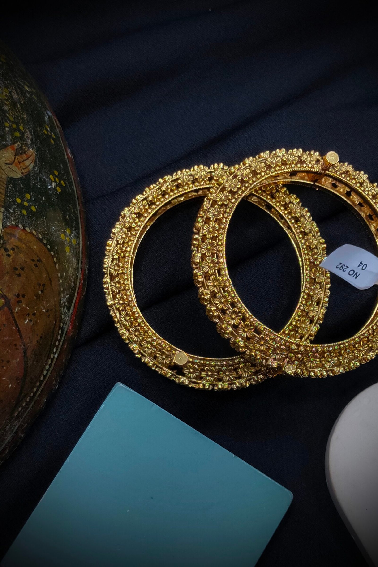 - ‘Evoke timeless elegance with our Antique Bangles, meticulously crafted from high-quality Brass for durability and charm. Adorned with intricate Rajwadi and Gold plating, these bangles exude traditional allure. Perfect for adding a touch of heritage to any ensemble, our collection offers a blend of classic style and modern sophistication