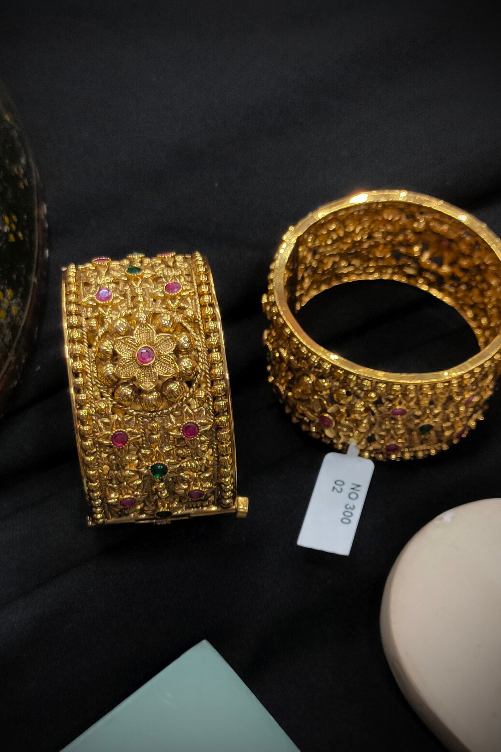 Manek Jewels Special Heritage Antique Bangles are beautifully handcrafted bangles inspired by traditional Indian designs. They feature intricate detailing, antique gold finishes, and classic motifs that reflect royal and cultural heritage. These bangles combine timeless elegance with fine craftsmanship, making them perfect for weddings, festive occasions, and traditional wear.