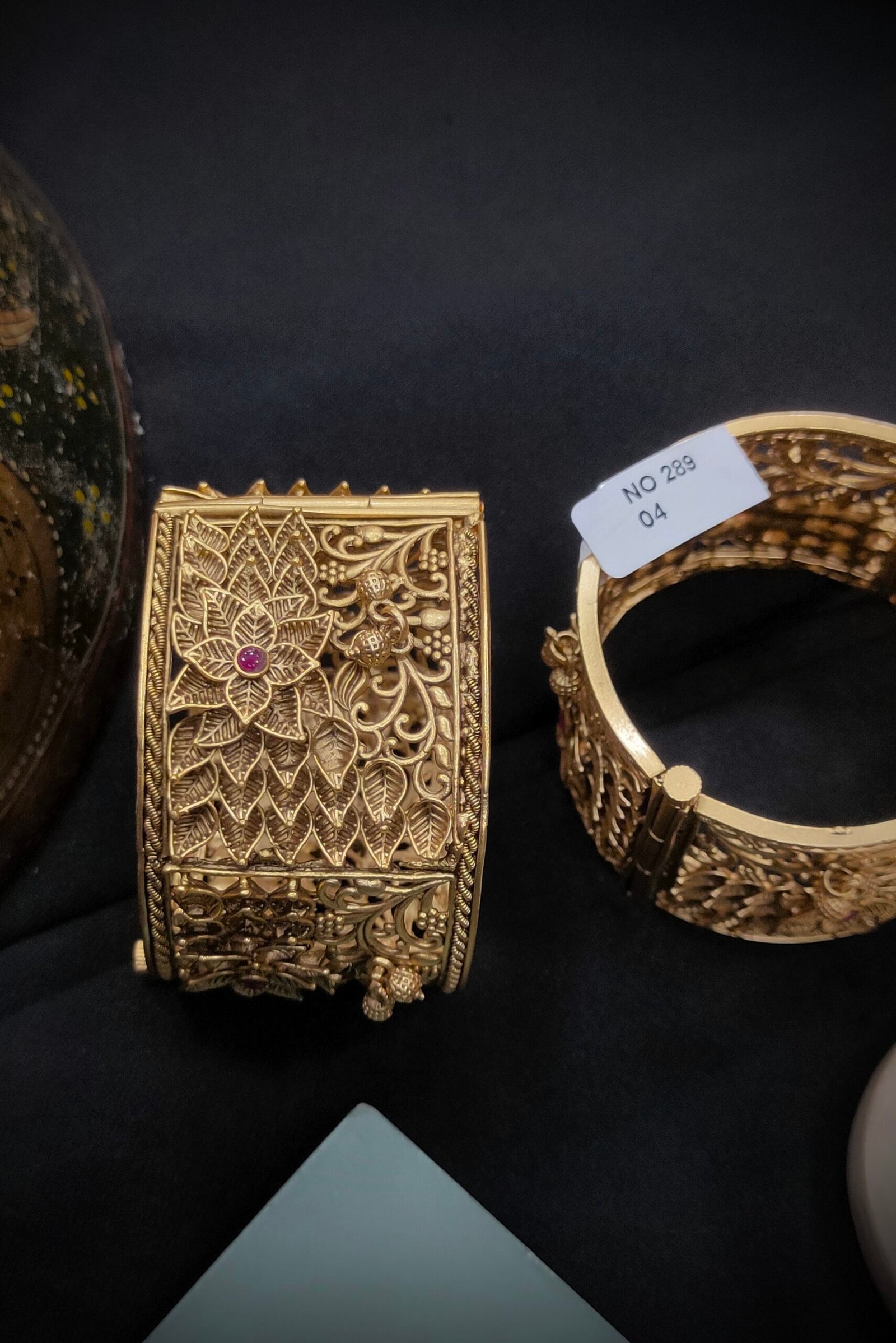 Manek Jewels Special Heritage Antique Bangles are beautifully handcrafted bangles inspired by traditional Indian designs. They feature intricate detailing, antique gold finishes, and classic motifs that reflect royal and cultural heritage. These bangles combine timeless elegance with fine craftsmanship, making them perfect for weddings, festive occasions, and traditional wear.