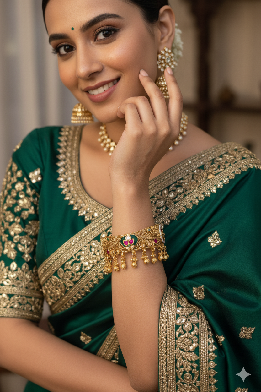 Manek Jewels Special Heritage Antique Bangles are beautifully handcrafted bangles inspired by traditional Indian designs. They feature intricate detailing, antique gold finishes, and classic motifs that reflect royal and cultural heritage. These bangles combine timeless elegance with fine craftsmanship, making them perfect for weddings, festive occasions, and traditional wear.