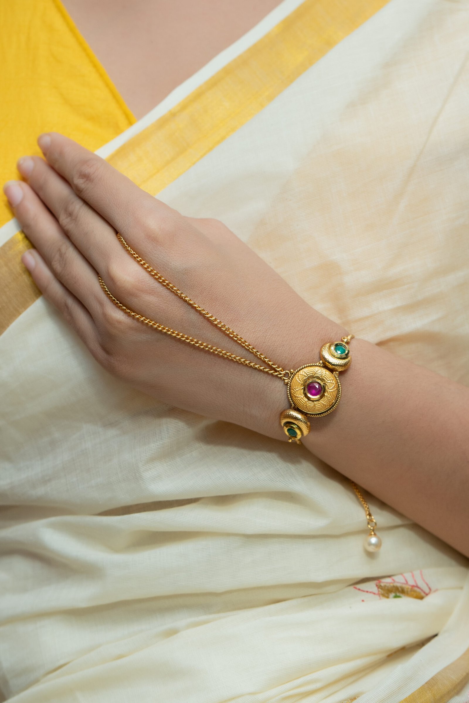 Elevate your ethnic look with our Antique Hath Phool, crafted from durable brass and adorned with Rajwadi and Gold plating. Inspired by traditional bangles, these pieces exude timeless charm and elegance. Add a touch of heritage to your ensemble with these intricately designed accessories. Perfect for weddings, festivals, or any celebration where you want to stand out with grace and style.