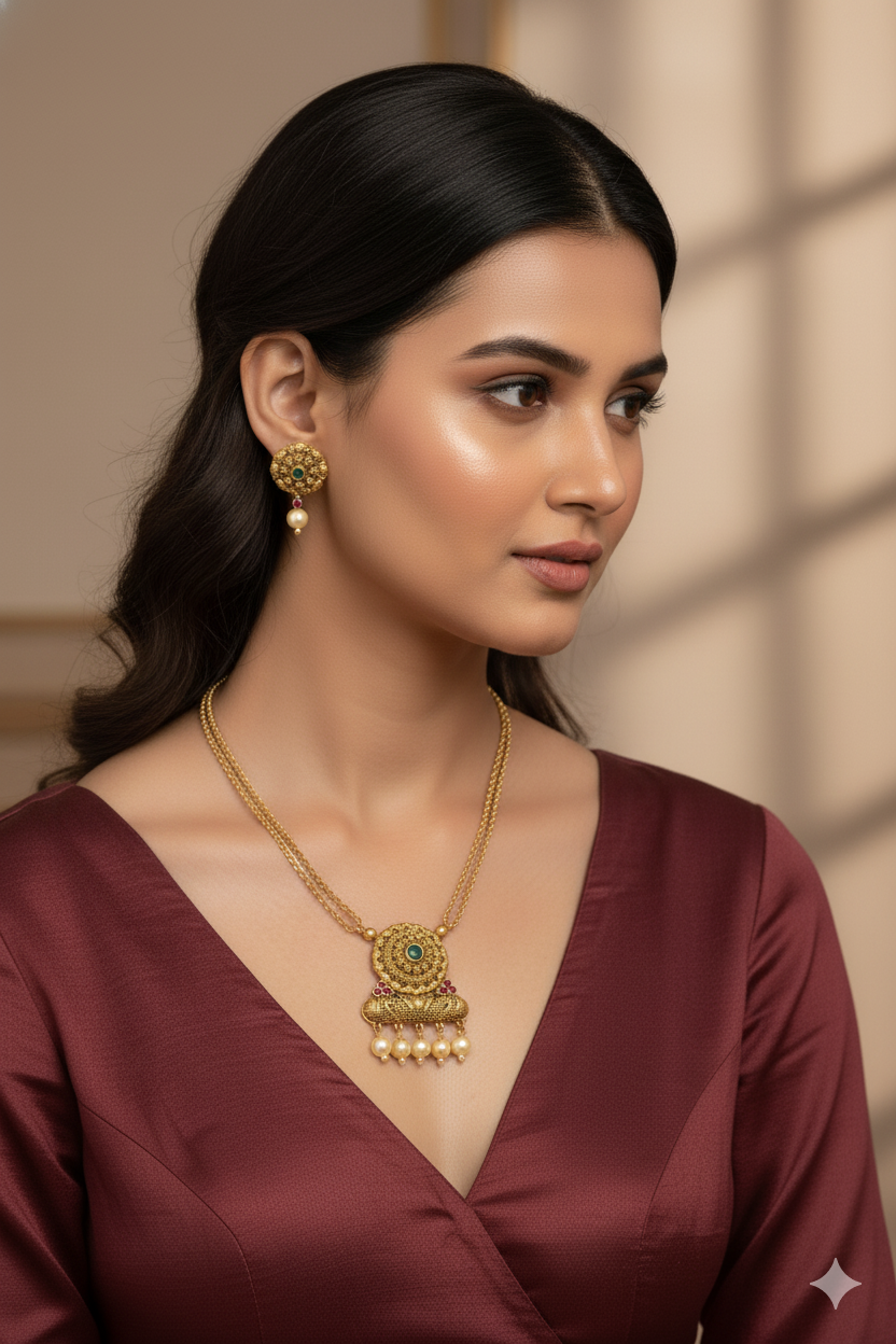Discover timeless elegance with our Antique Pendant Set Collection, beautifully crafted with intricate detailing and traditional artistry. Each set features exquisite pendants paired with matching earrings, designed in rich antique gold tones, adorned with stones, enamel work, and fine craftsmanship. Perfect for weddings, festive occasions, or adding a royal touch to your ethnic attire, these pendant sets reflect the grace of heritage jewelry with a modern charm.