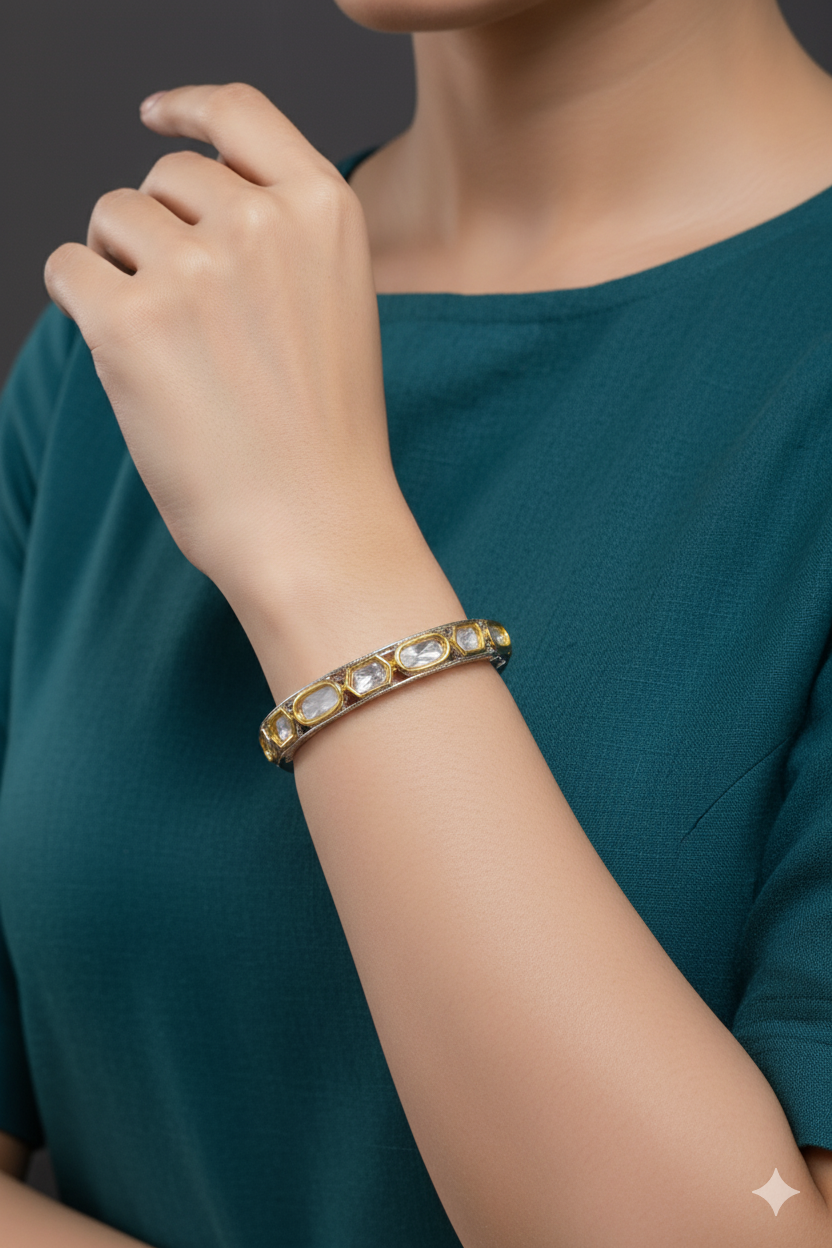 Elevate your style with our exquisite Kundan Bangles, adorned with dazzling Kundan stones for a touch of opulence. Crafted from high-quality Brass, these bangles promise durability and elegance. Embrace timeless beauty with our Copper (Rose Gold) plating, adding a hint of warmth to your ensemble. Explore the fusion of Gold and Silver plating options, offering versatility and sophistication. Shop our Kundan Bangles collection to make a statement of unparalleled luxury.