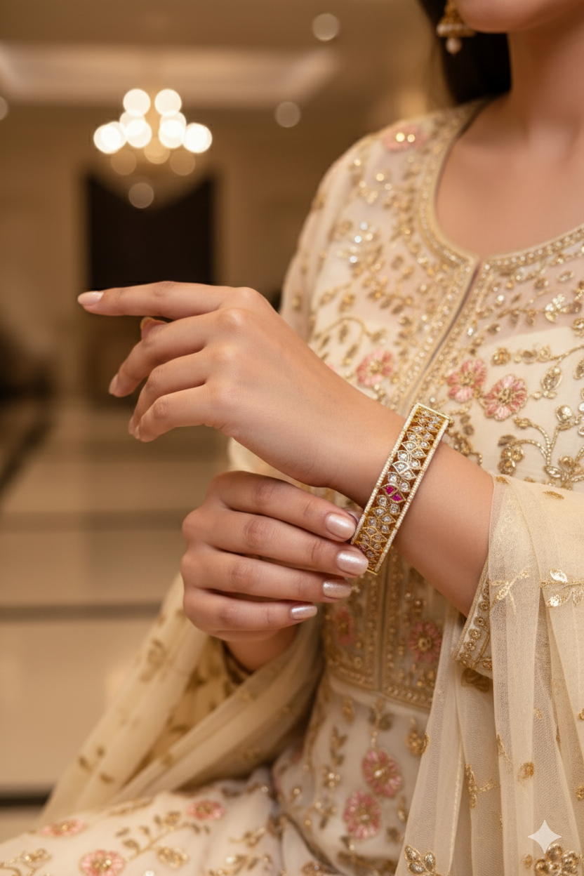 Elevate your style with our exquisite Kundan Bangles, adorned with dazzling Kundan stones for a touch of opulence. Crafted from high-quality Brass, these bangles promise durability and elegance. Embrace timeless beauty with our Copper (Rose Gold) plating, adding a hint of warmth to your ensemble. Explore the fusion of Gold and Silver plating options, offering versatility and sophistication. Shop our Kundan Bangles collection to make a statement of unparalleled luxury.