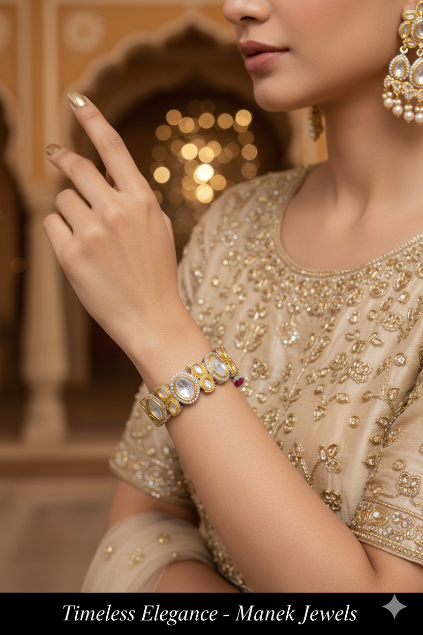 Elevate your style with our exquisite Kundan Bangles, adorned with dazzling Kundan stones for a touch of opulence. Crafted from high-quality Brass, these bangles promise durability and elegance. Embrace timeless beauty with our Copper (Rose Gold) plating, adding a hint of warmth to your ensemble. Explore the fusion of Gold and Silver plating options, offering versatility and sophistication. Shop our Kundan Bangles collection to make a statement of unparalleled luxury.
