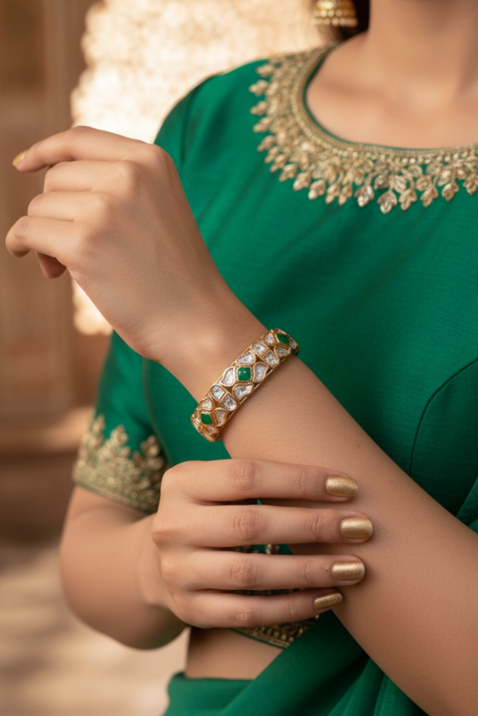 Elevate your style with our exquisite Kundan Bangles, adorned with dazzling Kundan stones for a touch of opulence. Crafted from high-quality Brass, these bangles promise durability and elegance. Embrace timeless beauty with our Copper (Rose Gold) plating, adding a hint of warmth to your ensemble. Explore the fusion of Gold and Silver plating options, offering versatility and sophistication. Shop our Kundan Bangles collection to make a statement of unparalleled luxury.