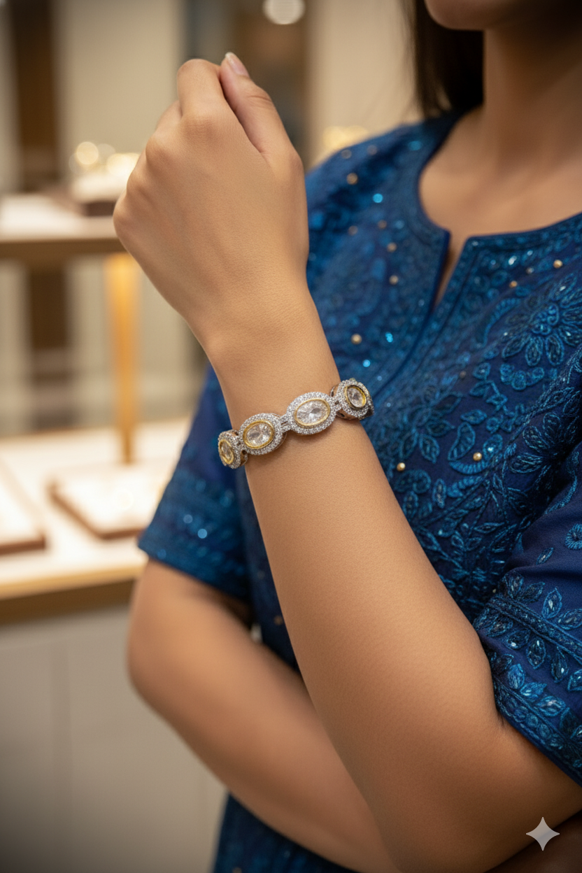 Elevate your style with our exquisite Kundan Bangles, adorned with dazzling Kundan stones for a touch of opulence. Crafted from high-quality Brass, these bangles promise durability and elegance. Embrace timeless beauty with our Copper (Rose Gold) plating, adding a hint of warmth to your ensemble. Explore the fusion of Gold and Silver plating options, offering versatility and sophistication. Shop our Kundan Bangles collection to make a statement of unparalleled luxury.