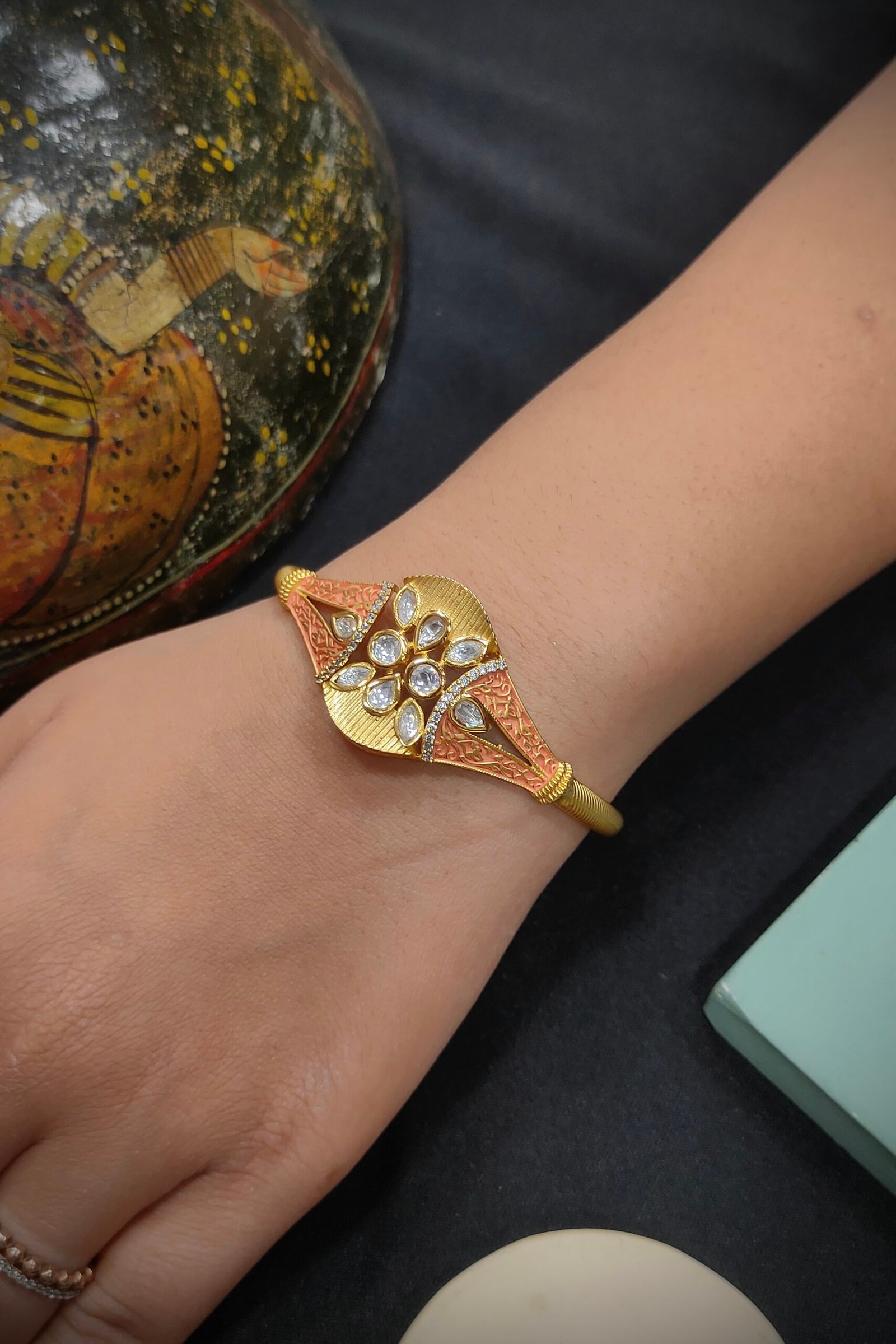 - Indulge in the timeless beauty of our Kundan Bracelets, where traditional craftsmanship meets contemporary elegance. Adorned with authentic Kundan stones, each bracelet exudes opulence and grace. Crafted from high-quality brass and plated with luxurious Copper in Rose Gold hue, or opt for the striking Gold+Silver combination for a versatile touch of sophistication. Elevate your ensemble with the exquisite allure of our Kundan Bracelets, perfect for adding a touch of regal charm to any occasion.