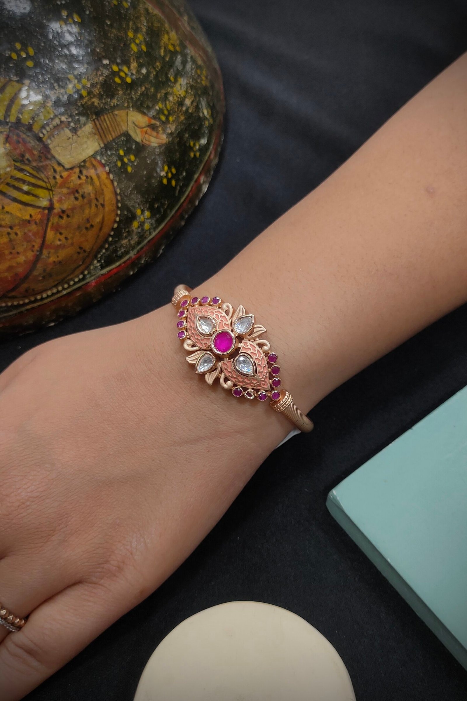 Indulge in the timeless beauty of our Kundan Bracelets, where traditional craftsmanship meets contemporary elegance. Adorned with authentic Kundan stones, each bracelet exudes opulence and grace. Crafted from high-quality brass and plated with luxurious Copper in Rose Gold hue, or opt for the striking Gold+Silver combination for a versatile touch of sophistication. Elevate your ensemble with the exquisite allure of our Kundan Bracelets, perfect for adding a touch of regal charm to any occasion.