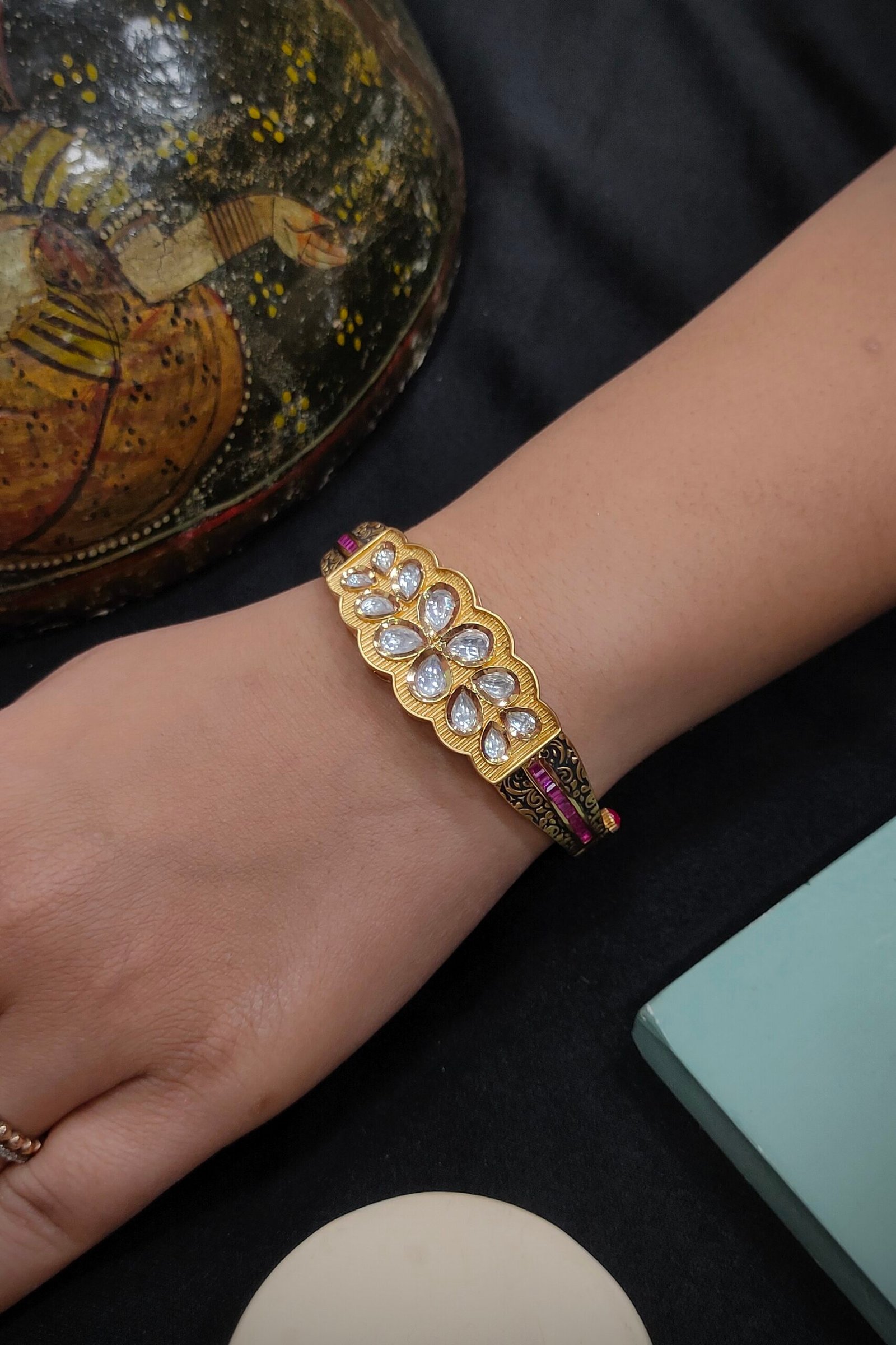 Indulge in the timeless beauty of our Kundan Bracelets, where traditional craftsmanship meets contemporary elegance. Adorned with authentic Kundan stones, each bracelet exudes opulence and grace. Crafted from high-quality brass and plated with luxurious Copper in Rose Gold hue, or opt for the striking Gold+Silver combination for a versatile touch of sophistication. Elevate your ensemble with the exquisite allure of our Kundan Bracelets, perfect for adding a touch of regal charm to any occasion.