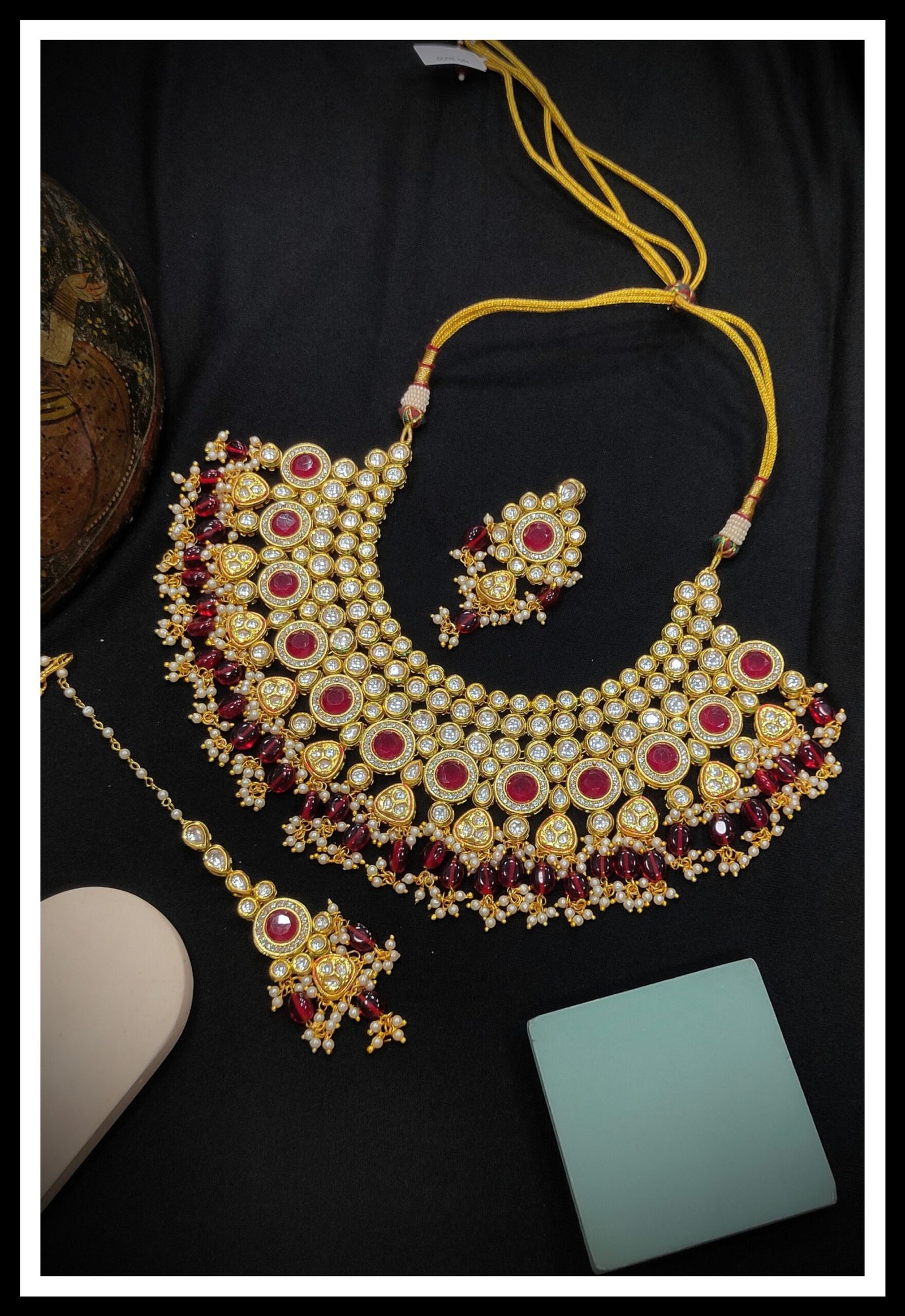 A Kundan bridal set is a luxurious and traditional Indian jewelry ensemble featuring uncut gemstones intricately set in gold or gold-plated frames. It typically includes a statement necklace, matching earrings, maang tikka (forehead accessory), and sometimes a nose ring and bangles. Known for its opulent and regal look, a Kundan bridal set adds elegance and a royal touch to bridal attire.