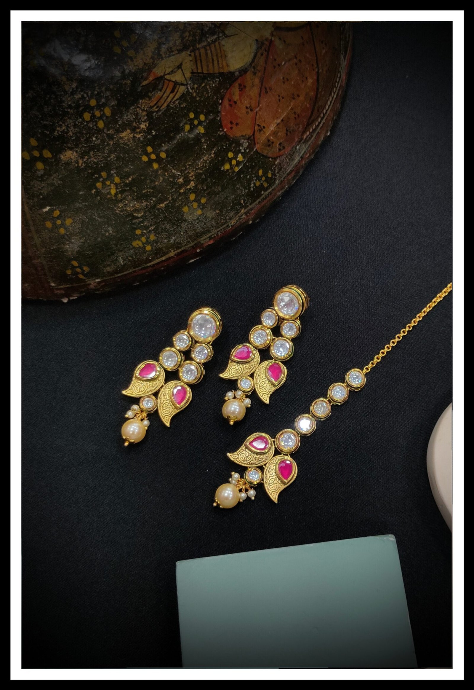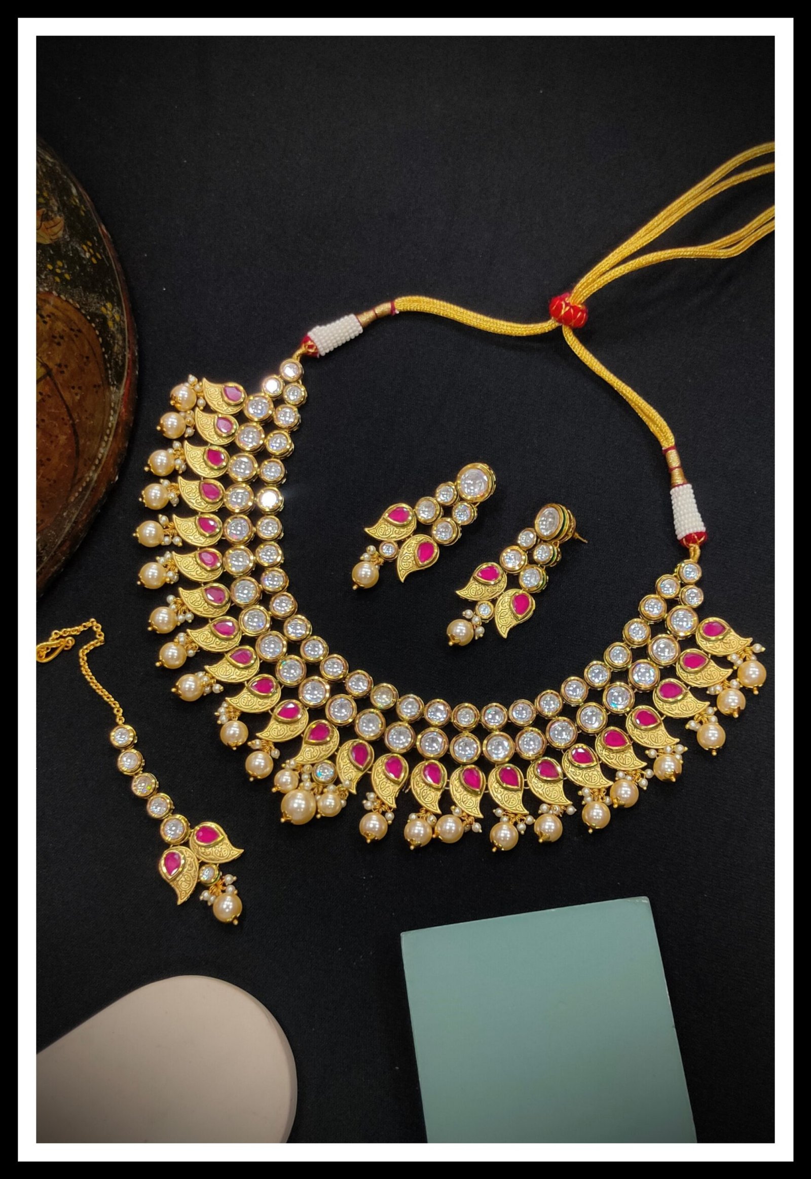 A Kundan bridal set is a luxurious and traditional Indian jewelry ensemble featuring uncut gemstones intricately set in gold or gold-plated frames. It typically includes a statement necklace, matching earrings, maang tikka (forehead accessory), and sometimes a nose ring and bangles. Known for its opulent and regal look, a Kundan bridal set adds elegance and a royal touch to bridal attire.