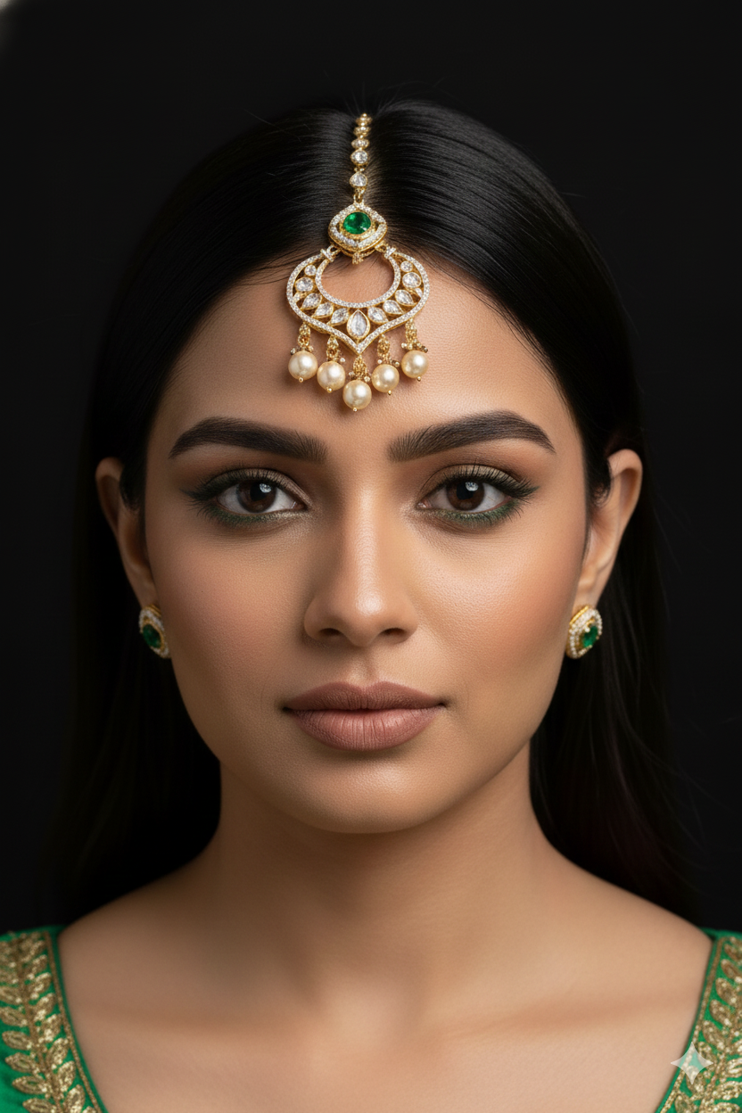 Elevate your elegance with our Kundan Mangtika, featuring authentic Kundan stones delicately set on brass. Available in Copper with Rose Gold plating or a stunning Gold+Silver combination, this Mangtika exudes timeless sophistication. Perfect for weddings or special occasions, it adds a regal touch to your ensemble. Experience the enchanting beauty and exquisite craftsmanship of our Kundan Mangtika, a symbol of refined grace and style.