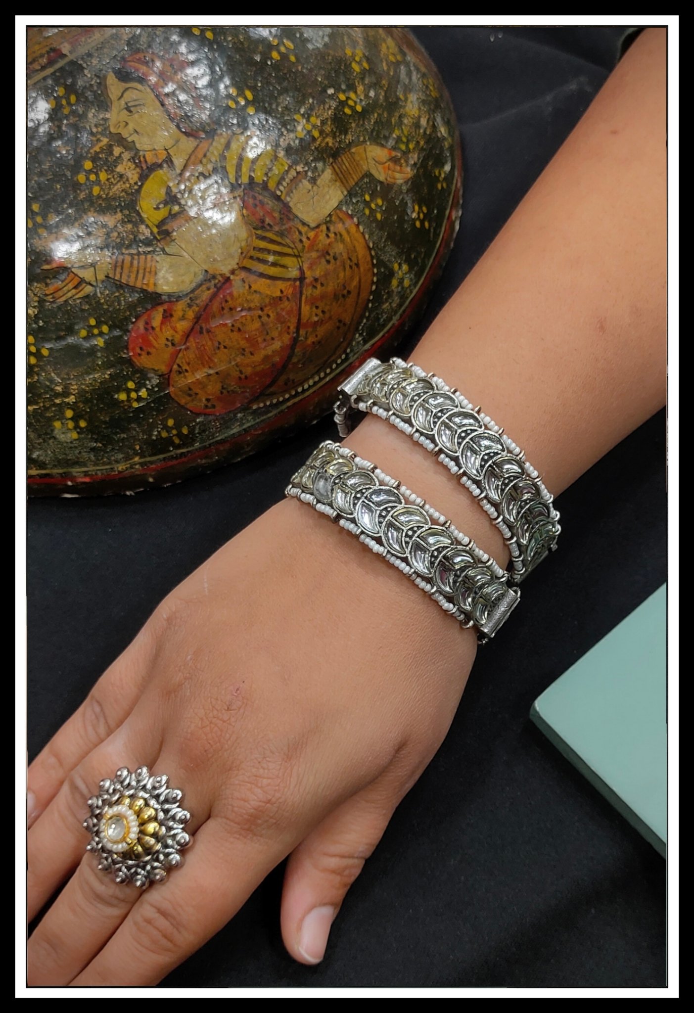 Discover the allure of our Oxidized Bangles, meticulously crafted from premium Brass and German Silver for enduring quality. Adorned with intricate designs, these bangles exude traditional charm. Available in classic Silver plating, as well as the elegant Silver+Gold combination, they offer versatile styling options. Elevate your look with these timeless pieces that capture the essence of cultural elegance