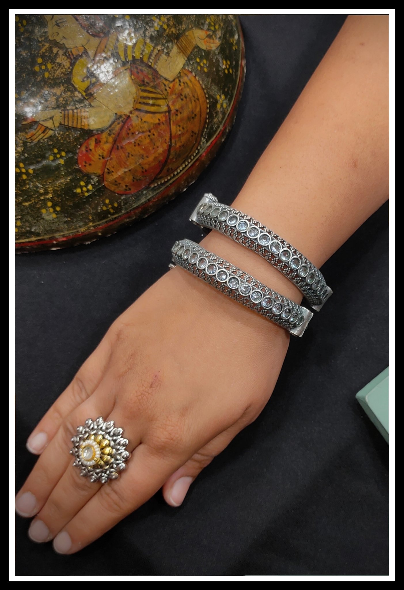 Discover the allure of our Oxidized Bangles, meticulously crafted from premium Brass and German Silver for enduring quality. Adorned with intricate designs, these bangles exude traditional charm. Available in classic Silver plating, as well as the elegant Silver+Gold combination, they offer versatile styling options. Elevate your look with these timeless pieces that capture the essence of cultural elegance