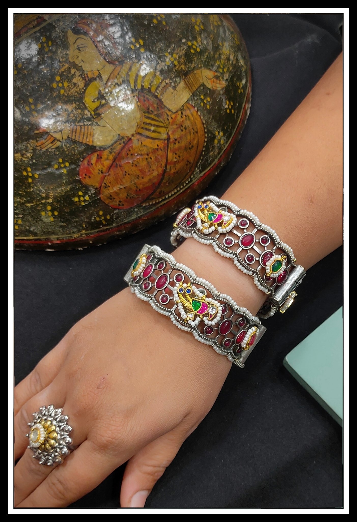 Discover the allure of our Oxidized Bangles, meticulously crafted from premium Brass and German Silver for enduring quality. Adorned with intricate designs, these bangles exude traditional charm. Available in classic Silver plating, as well as the elegant Silver+Gold combination, they offer versatile styling options. Elevate your look with these timeless pieces that capture the essence of cultural elegance