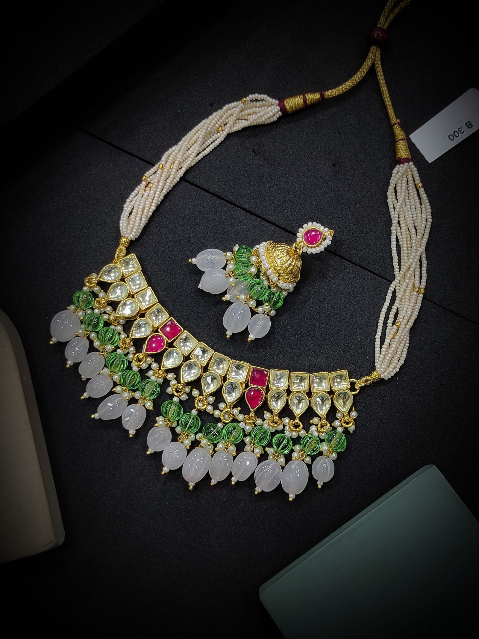 A Pachi Kundan bridal set typically features intricate designs crafted from a combination of Kundan stones and traditional Pachi work. The set usually includes a statement necklace, matching earrings, and sometimes a maang tikka or bracelet.The necklace often showcases a mix of colorful gemstones set in gold, creating a regal appearance. The earrings are designed to complement the necklace, featuring elaborate patterns and dangling elements. The overall aesthetic is rich and ornate, making it perfect for weddings and festive occasions, embodying a blend of traditional artistry and modern elegance.The craftsmanship highlights detailed floral motifs, peacock designs, or geometric patterns, reflecting cultural heritage while enhancing the bride’s beauty.
