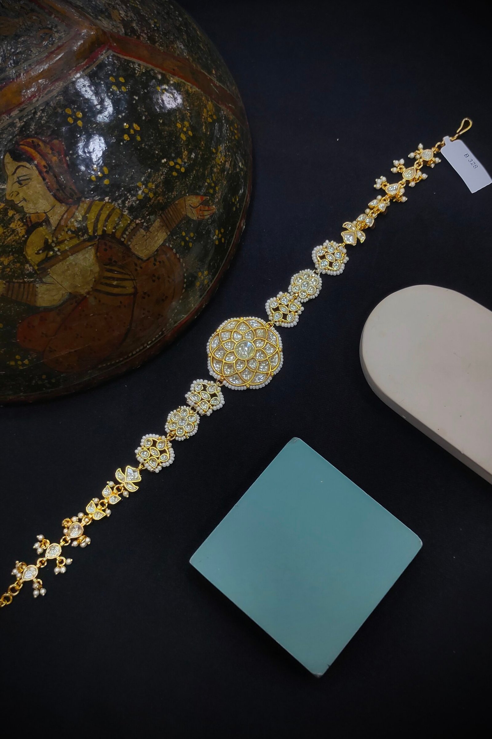 Adorn your forehead with regal elegance using our Pachi/Jadau Kundan Matha Patti, meticulously designed for timeless allure. Each piece showcases exquisite Pachi stones delicately set on brass, exuding opulence and grace. Finished with luxurious Gold plating, this Matha Patti adds a touch of sophistication to any ensemble. Experience the richness of tradition and craftsmanship with our Pachi/Jadau Kundan Matha Patti, perfect for enhancing your bridal or festive look with unparalleled beauty
