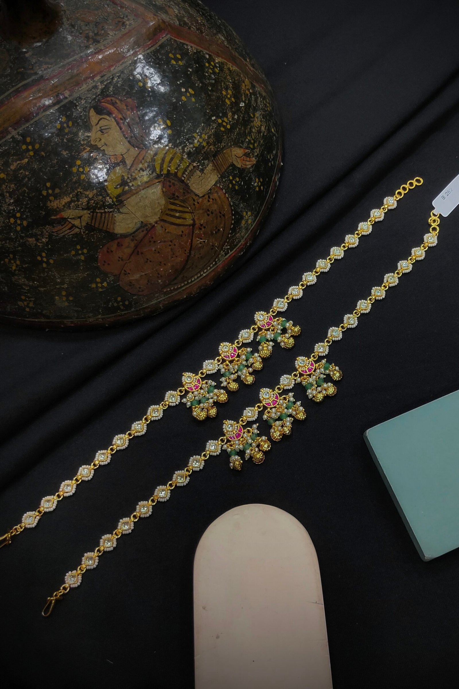 Step into traditional elegance with our Pachi/Jadau Kundan Payal, meticulously crafted from brass and adorned with authentic Pachi stones. Finished with luxurious Gold plating, this Payal exudes timeless charm and opulence. Elevate your ensemble with the regal allure of our Pachi/Jadau Kundan Payal, perfect for adding a touch of sophistication to your feet. Experience the exquisite craftsmanship and majestic beauty of this captivating accessory.
