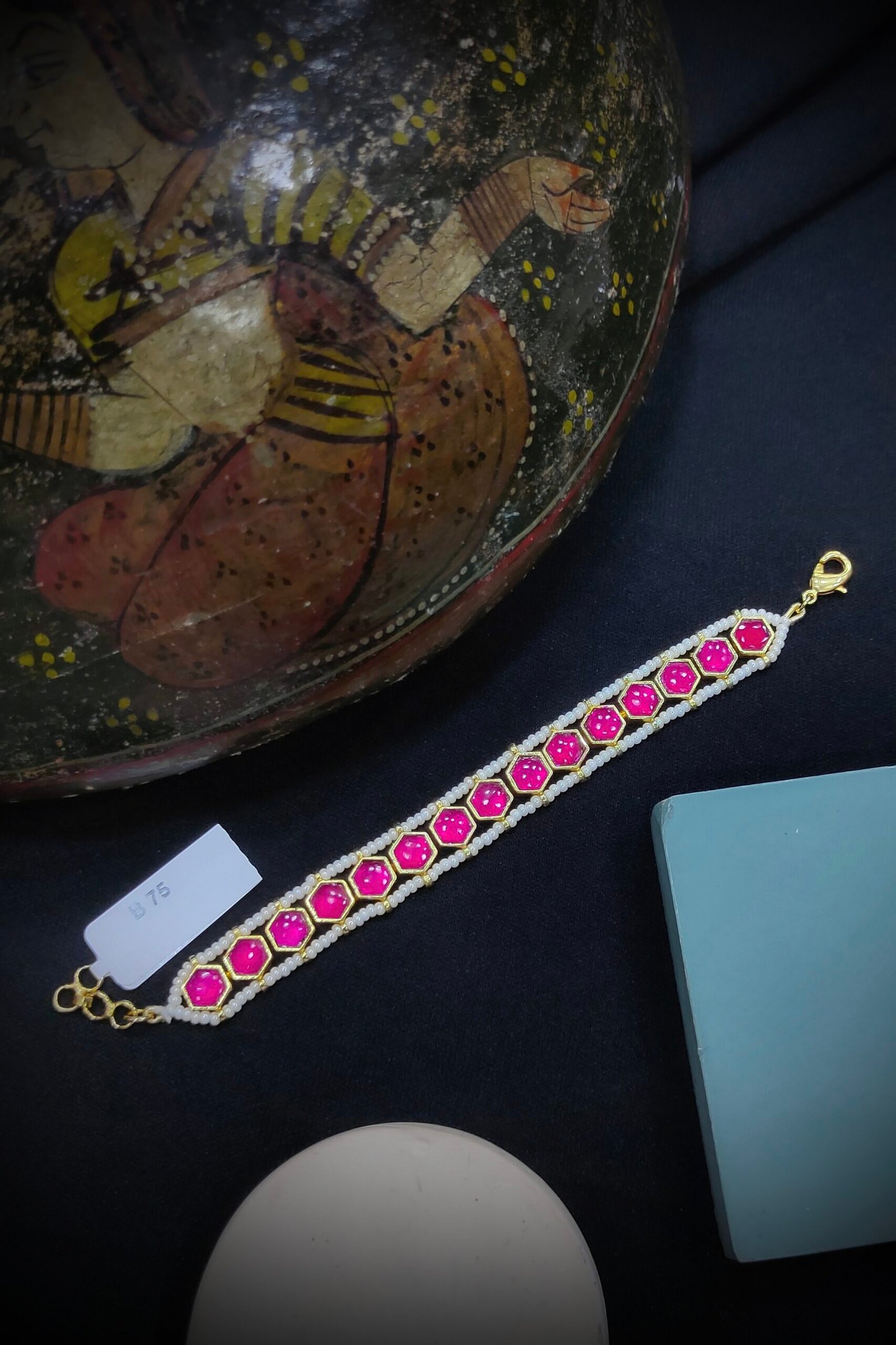 A Pachi Kundan bracelet is a traditional piece of Indian jewelry, known for its intricate craftsmanship. It features a combination of Pachi work, which involves the use of uncut gemstones set in gold or silver, and Kundan techniques that incorporate polished stones.The bracelet often showcases elaborate designs, with motifs inspired by nature, mythology, or geometric patterns. The uncut stones give it a vintage appeal, while the vibrant colors of the gemstones add a touch of elegance. It’s typically worn for special occasions and celebrations, making it a cherished accessory in bridal trousseaus and festive attire.