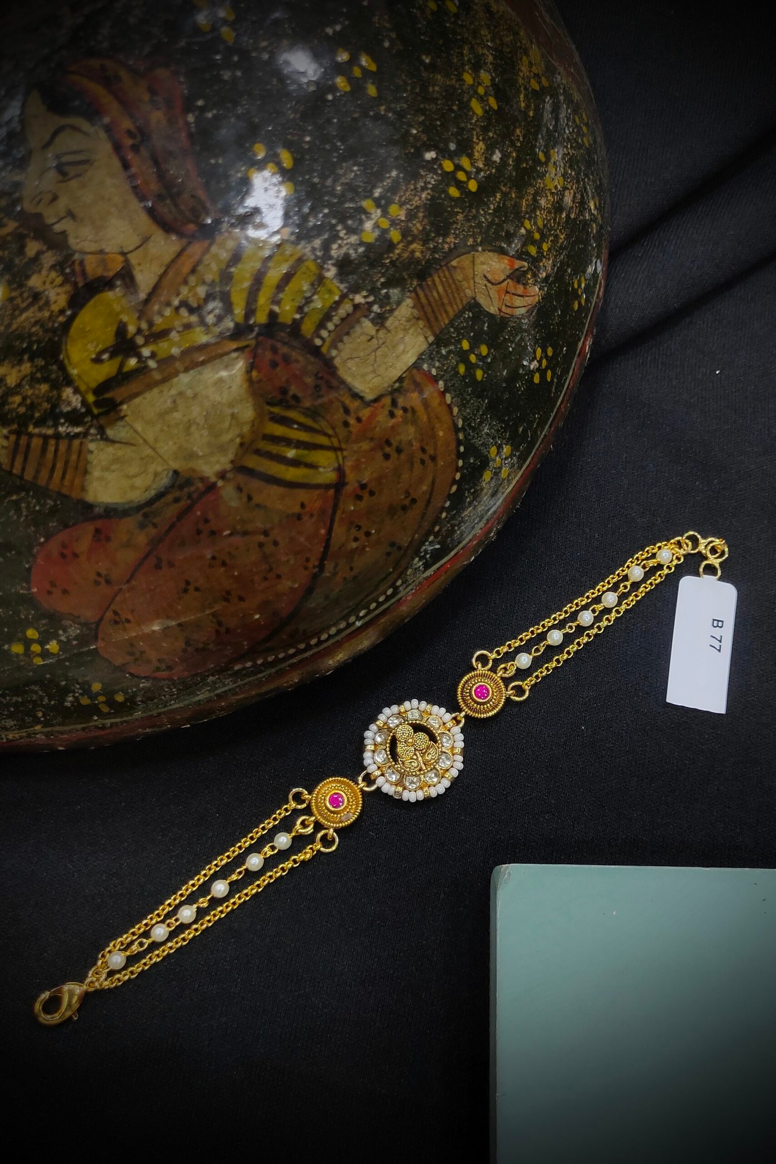 A Pachi Kundan bracelet is a traditional piece of Indian jewelry, known for its intricate craftsmanship. It features a combination of Pachi work, which involves the use of uncut gemstones set in gold or silver, and Kundan techniques that incorporate polished stones.The bracelet often showcases elaborate designs, with motifs inspired by nature, mythology, or geometric patterns. The uncut stones give it a vintage appeal, while the vibrant colors of the gemstones add a touch of elegance. It’s typically worn for special occasions and celebrations, making it a cherished accessory in bridal trousseaus and festive attire.
