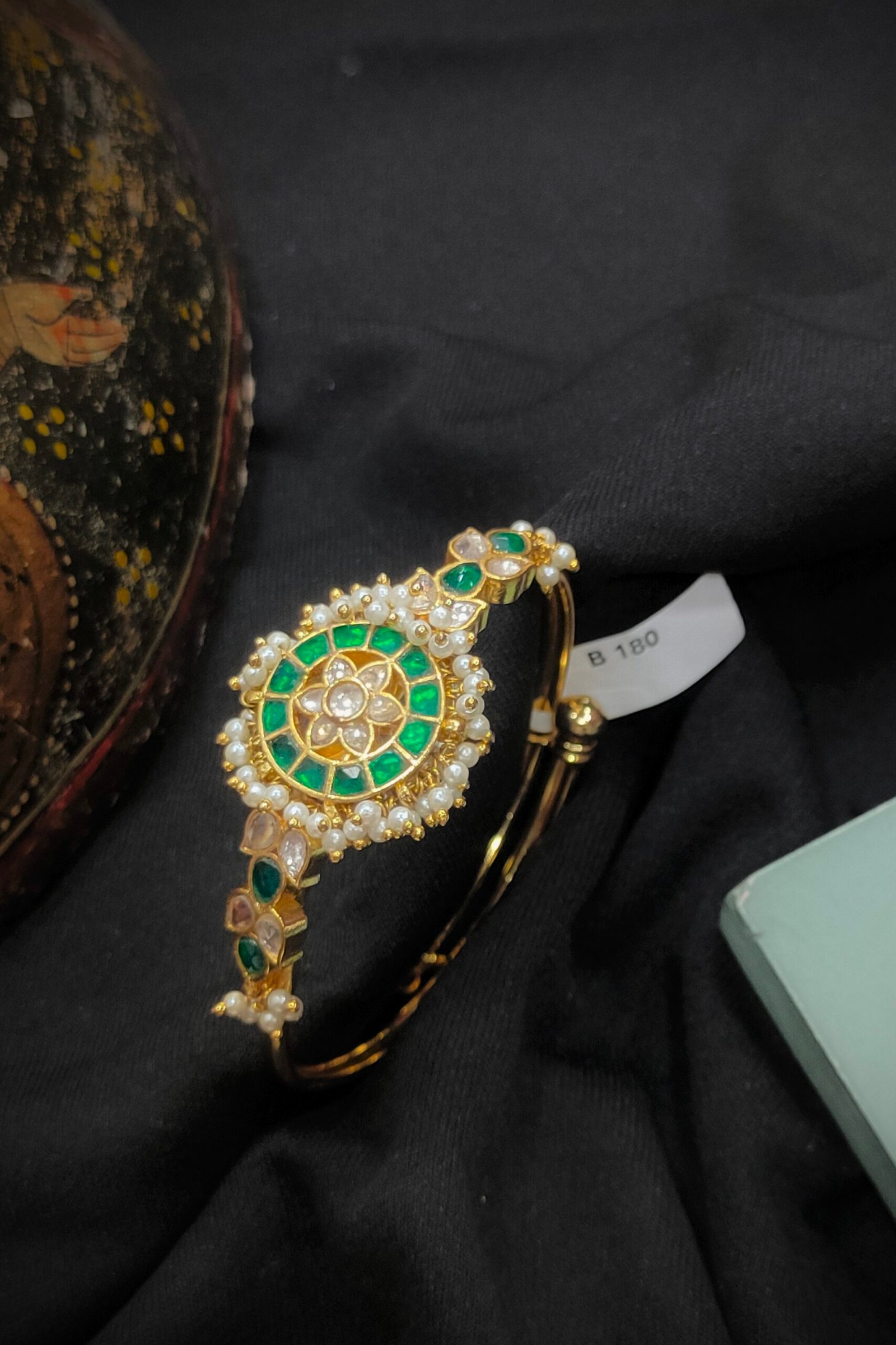 A Pachi Kundan bracelet is a traditional piece of Indian jewelry, known for its intricate craftsmanship. It features a combination of Pachi work, which involves the use of uncut gemstones set in gold or silver, and Kundan techniques that incorporate polished stones.The bracelet often showcases elaborate designs, with motifs inspired by nature, mythology, or geometric patterns. The uncut stones give it a vintage appeal, while the vibrant colors of the gemstones add a touch of elegance. It’s typically worn for special occasions and celebrations, making it a cherished accessory in bridal trousseaus and festive attire.