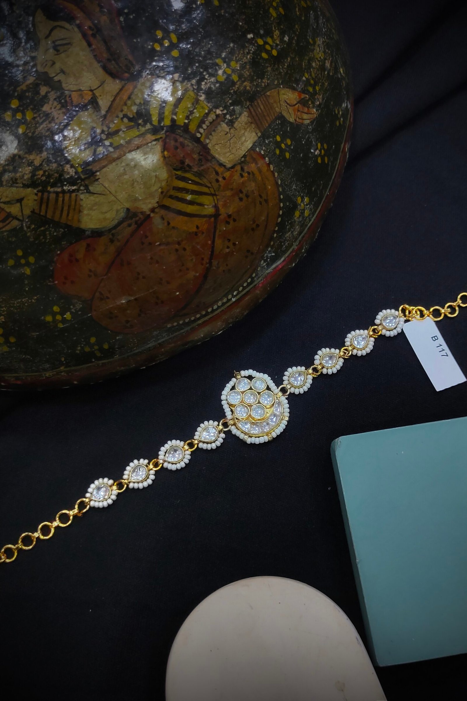 A Pachi Kundan bracelet is a traditional piece of Indian jewelry, known for its intricate craftsmanship. It features a combination of Pachi work, which involves the use of uncut gemstones set in gold or silver, and Kundan techniques that incorporate polished stones.The bracelet often showcases elaborate designs, with motifs inspired by nature, mythology, or geometric patterns. The uncut stones give it a vintage appeal, while the vibrant colors of the gemstones add a touch of elegance. It’s typically worn for special occasions and celebrations, making it a cherished accessory in bridal trousseaus and festive attire.