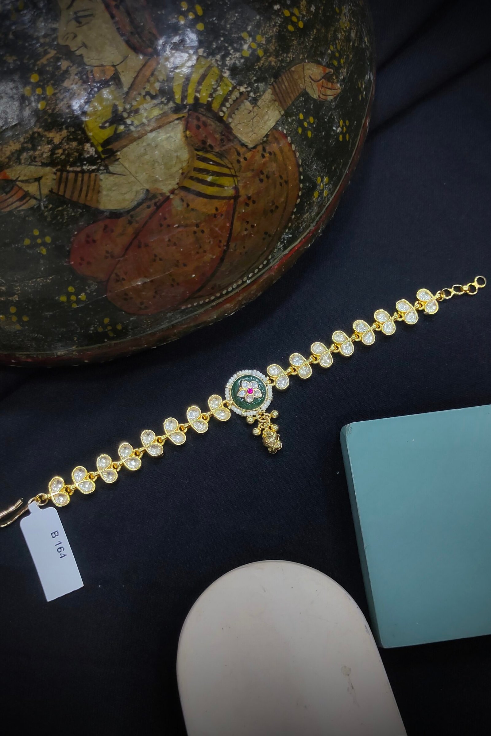A Pachi Kundan bracelet is a traditional piece of Indian jewelry, known for its intricate craftsmanship. It features a combination of Pachi work, which involves the use of uncut gemstones set in gold or silver, and Kundan techniques that incorporate polished stones.The bracelet often showcases elaborate designs, with motifs inspired by nature, mythology, or geometric patterns. The uncut stones give it a vintage appeal, while the vibrant colors of the gemstones add a touch of elegance. It’s typically worn for special occasions and celebrations, making it a cherished accessory in bridal trousseaus and festive attire.