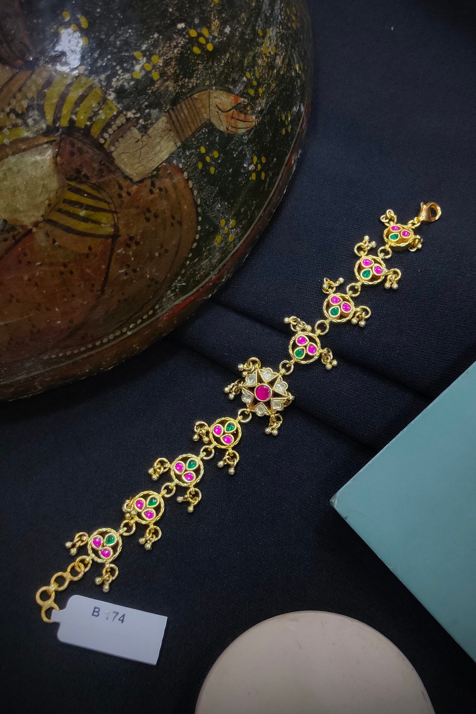 A Pachi Kundan bracelet is a traditional piece of Indian jewelry, known for its intricate craftsmanship. It features a combination of Pachi work, which involves the use of uncut gemstones set in gold or silver, and Kundan techniques that incorporate polished stones.The bracelet often showcases elaborate designs, with motifs inspired by nature, mythology, or geometric patterns. The uncut stones give it a vintage appeal, while the vibrant colors of the gemstones add a touch of elegance. It’s typically worn for special occasions and celebrations, making it a cherished accessory in bridal trousseaus and festive attire.
