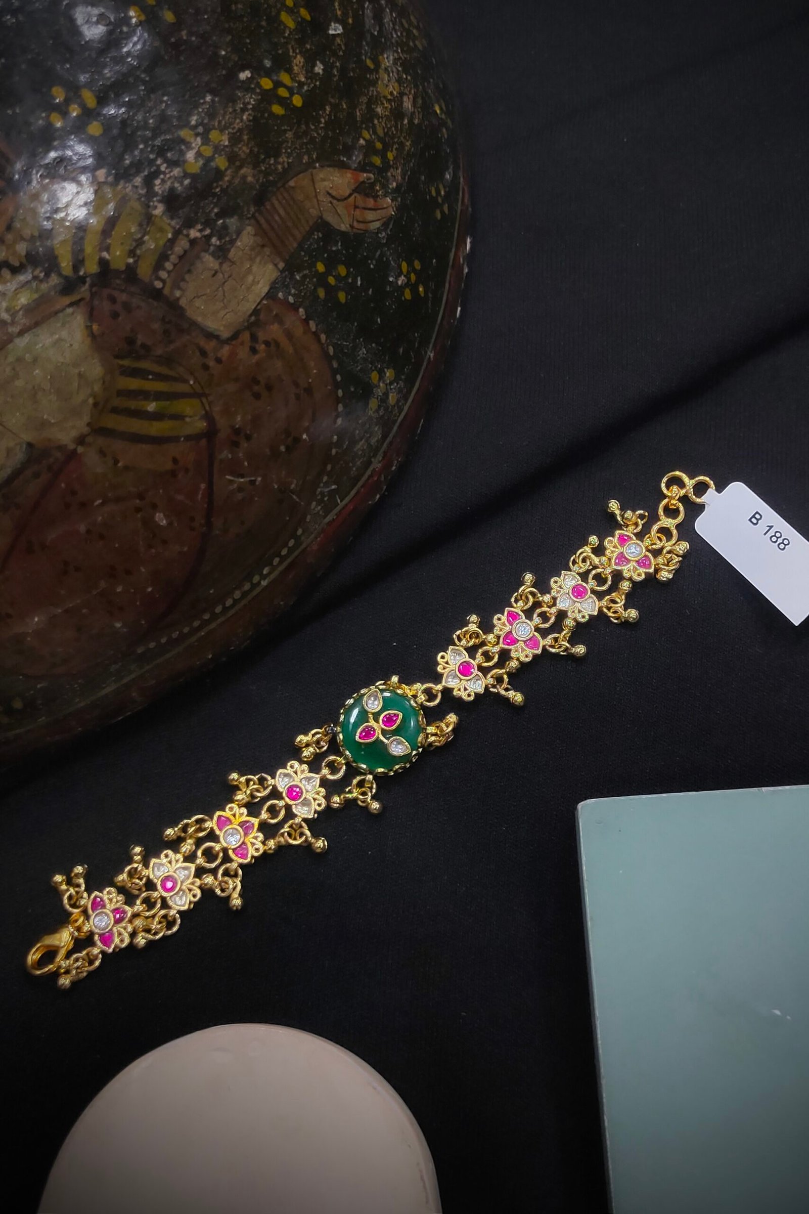 A Pachi Kundan bracelet is a traditional piece of Indian jewelry, known for its intricate craftsmanship. It features a combination of Pachi work, which involves the use of uncut gemstones set in gold or silver, and Kundan techniques that incorporate polished stones.The bracelet often showcases elaborate designs, with motifs inspired by nature, mythology, or geometric patterns. The uncut stones give it a vintage appeal, while the vibrant colors of the gemstones add a touch of elegance. It’s typically worn for special occasions and celebrations, making it a cherished accessory in bridal trousseaus and festive attire.