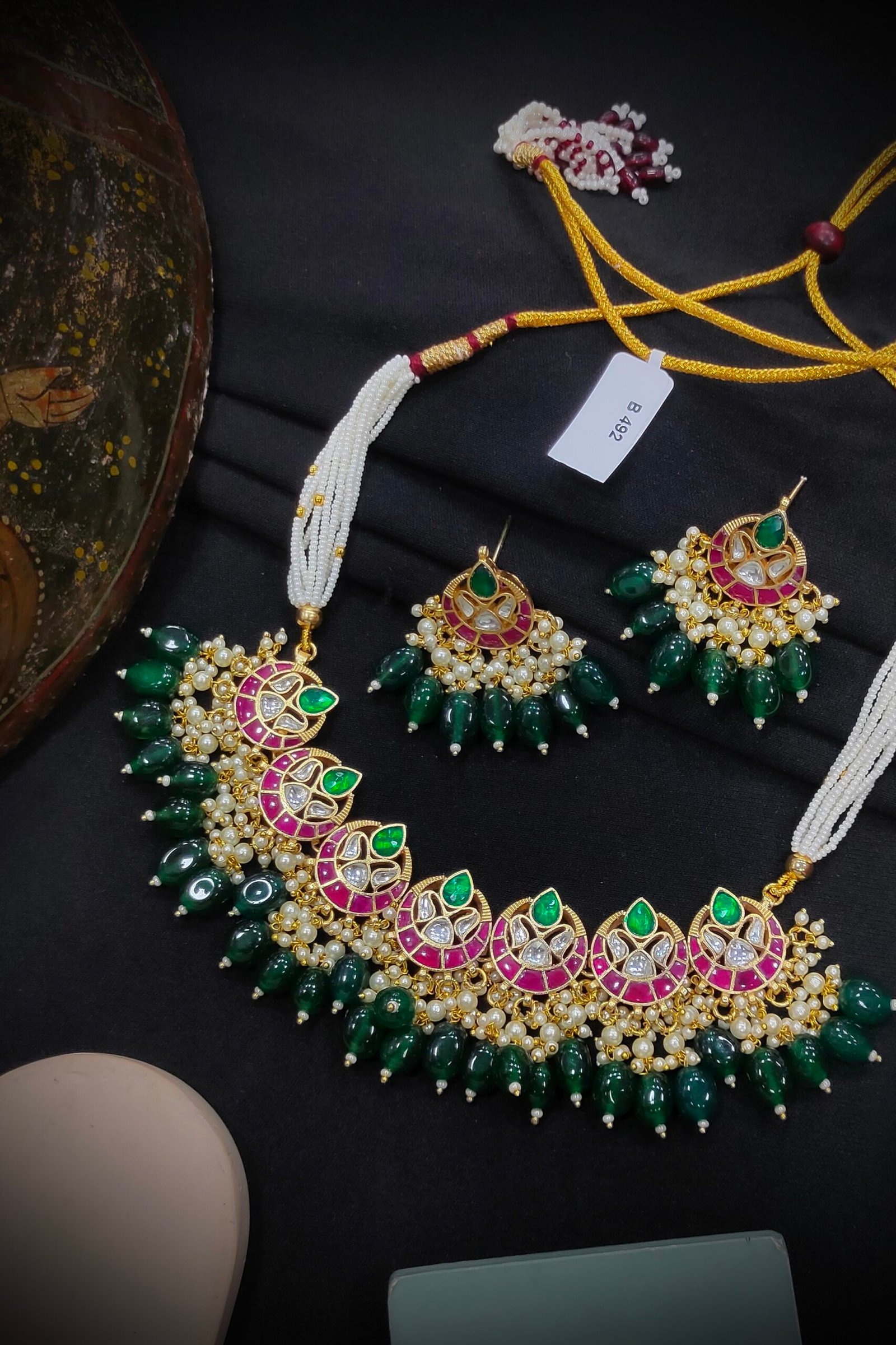 Make a statement of timeless elegance with our Pachi Kundan Choker & Necklace Set, a luxurious blend of traditional craftsmanship and regal charm. This set features a beautifully handcrafted choker for a bold, elegant neckline and a matching long necklace for layered grandeur – both adorned with authentic Pachi Kundan stones and detailed meenakari/enamel work.