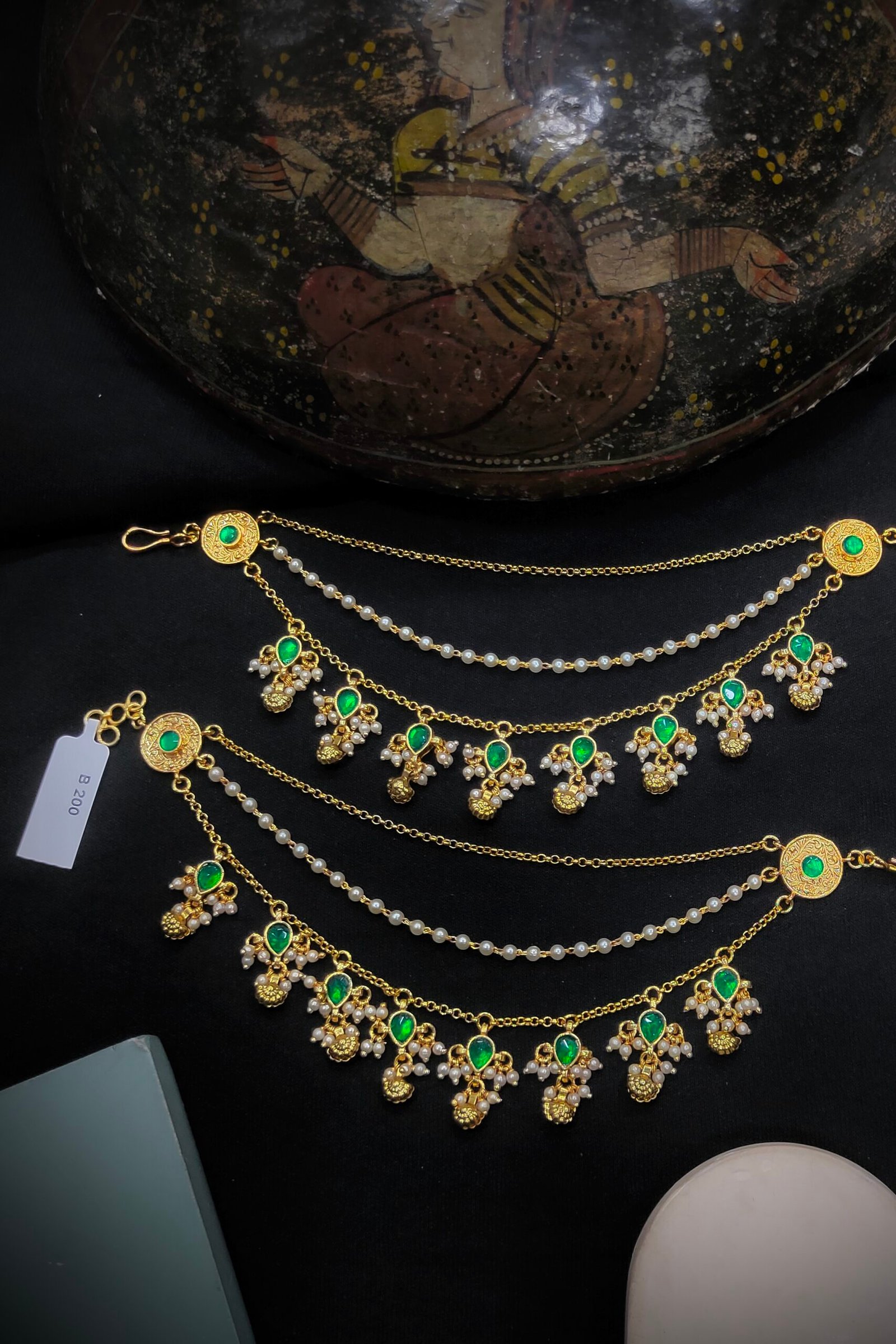 Elegant Pachi Kundan Jadau earchains beautifully handcrafted with traditional artistry. These exquisite earrings feature rich kundan stones, intricate jadau detailing, and delicate chains that add a royal charm. Perfect for bridal and festive looks, they combine heritage design with timeless elegance.