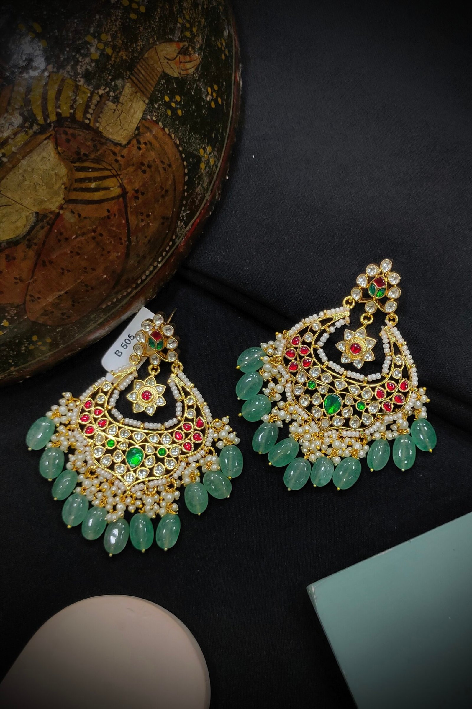 Embrace the opulence of our Pachi Kundan/Jadau Earrings, a fusion of tradition and luxury. Each earring showcases exquisite Pachi stones set delicately upon brass, radiating timeless allure. Finished with lustrous Gold plating, these earrings exude regal elegance. Elevate your ensemble with the enchanting beauty of our Pachi Kundan/Jadau Earrings, perfect for adding a touch of sophistication to any occasion. Experience the richness of Indian craftsmanship and indulge in the exquisite charm of these captivating pieces.