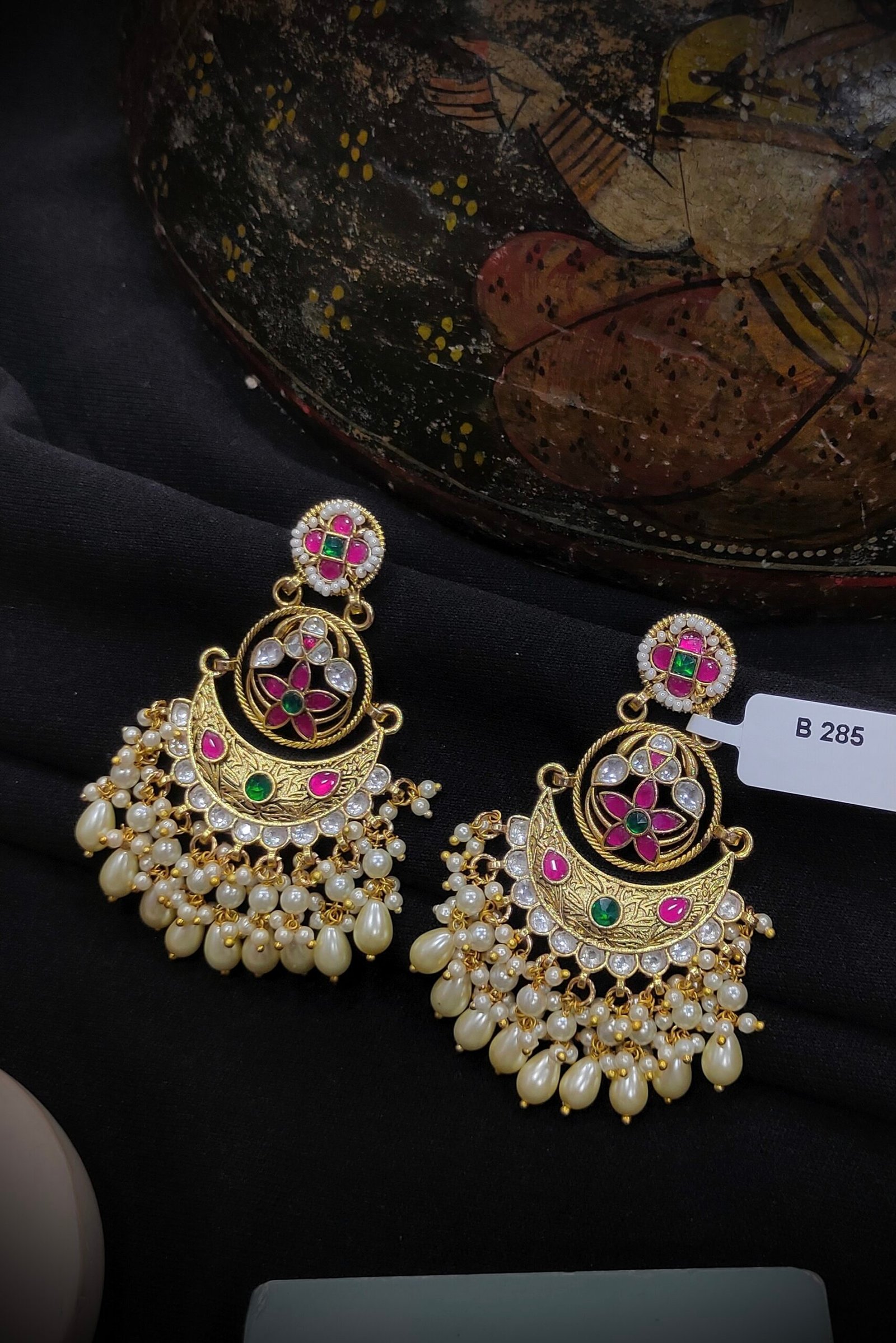 Exquisitely handcrafted, these Jadau Kundan (Pachi Kundan) heritage earrings capture the timeless beauty of royal craftsmanship. Each pair is adorned with intricate meenakari detailing, uncut stones, and delicate pearls — a true celebration of India’s regal jewelry traditions.