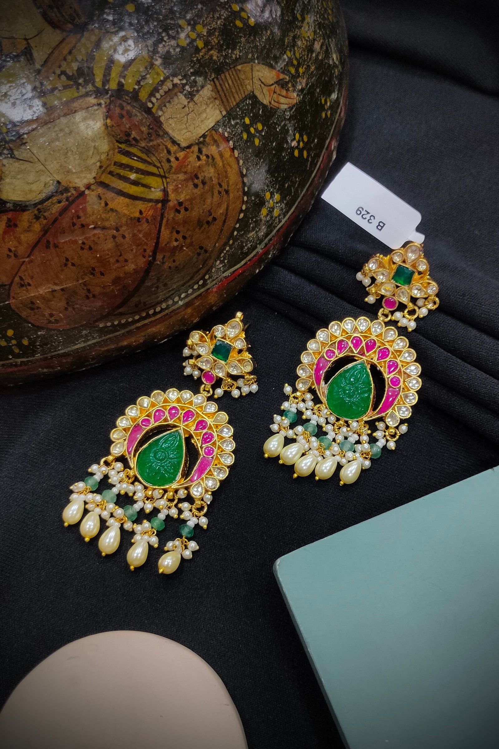 Embrace the opulence of our Pachi Kundan/Jadau Earrings, a fusion of tradition and luxury. Each earring showcases exquisite Pachi stones set delicately upon brass, radiating timeless allure. Finished with lustrous Gold plating, these earrings exude regal elegance. Elevate your ensemble with the enchanting beauty of our Pachi Kundan/Jadau Earrings, perfect for adding a touch of sophistication to any occasion. Experience the richness of Indian craftsmanship and indulge in the exquisite charm of these captivating pieces.