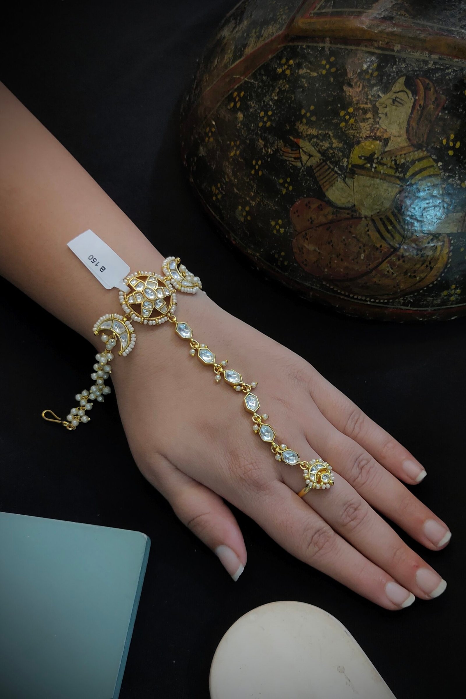 Indulge in royal splendor with our Pachi Kundan/Jadau Hath Phool, crafted from brass and adorned with intricate Rajwadi and Gold plating. Each piece radiates timeless charm and opulence, perfect for traditional occasions. Elevate your ensemble with the regal allure of these Hath Phools, adding a touch of sophistication to your look. Experience the exquisite craftsmanship and majestic beauty of these captivating accessories