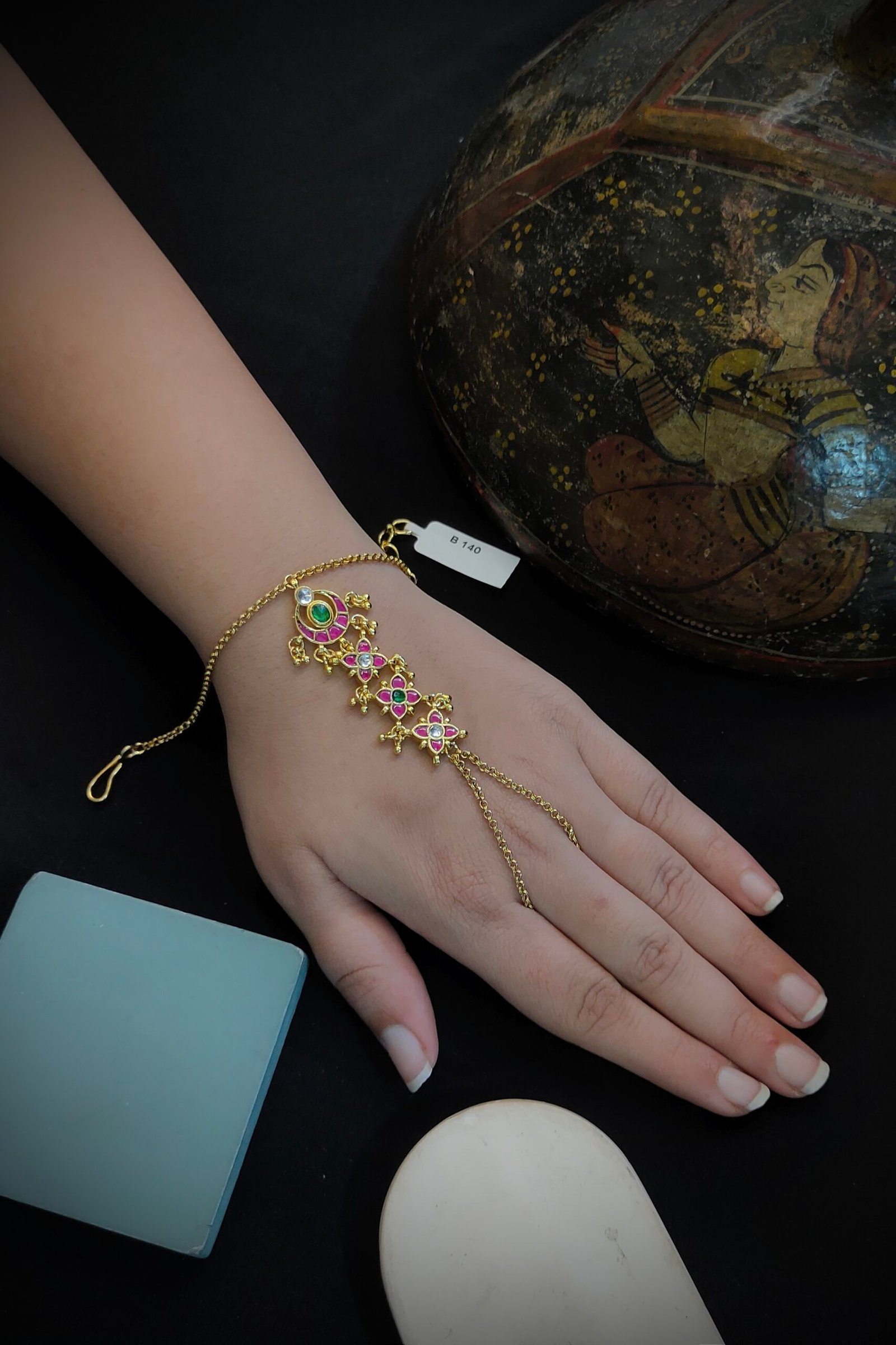 Indulge in royal splendor with our Pachi Kundan/Jadau Hath Phool, crafted from brass and adorned with intricate Rajwadi and Gold plating. Each piece radiates timeless charm and opulence, perfect for traditional occasions. Elevate your ensemble with the regal allure of these Hath Phools, adding a touch of sophistication to your look. Experience the exquisite craftsmanship and majestic beauty of these captivating accessories