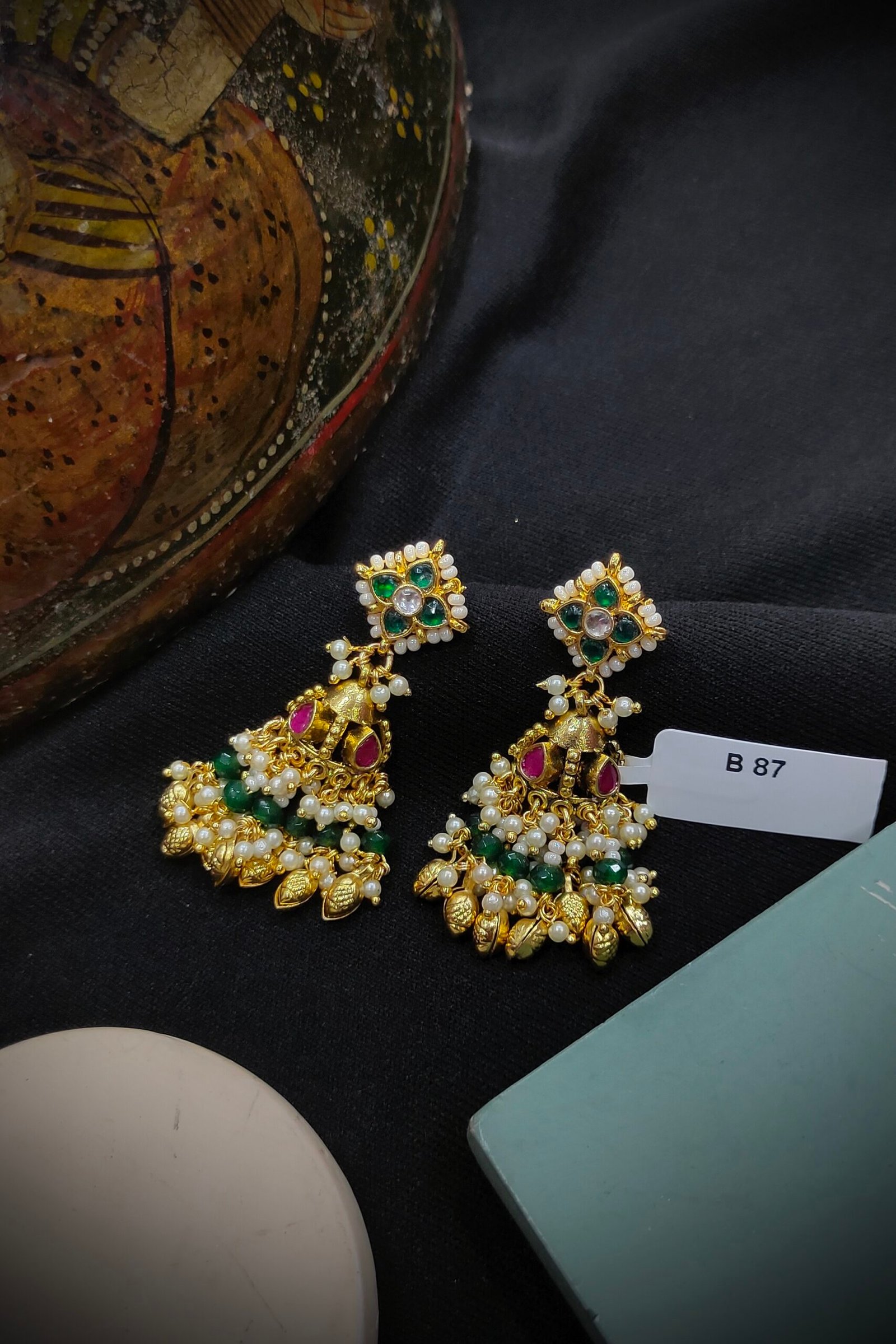 Embrace the opulence of our Pachi Kundan/Jadau Earrings, a fusion of tradition and luxury. Each earring showcases exquisite Pachi stones set delicately upon brass, radiating timeless allure. Finished with lustrous Gold plating, these earrings exude regal elegance. Elevate your ensemble with the enchanting beauty of our Pachi Kundan/Jadau Earrings, perfect for adding a touch of sophistication to any occasion. Experience the richness of Indian craftsmanship and indulge in the exquisite charm of these captivating pieces.
