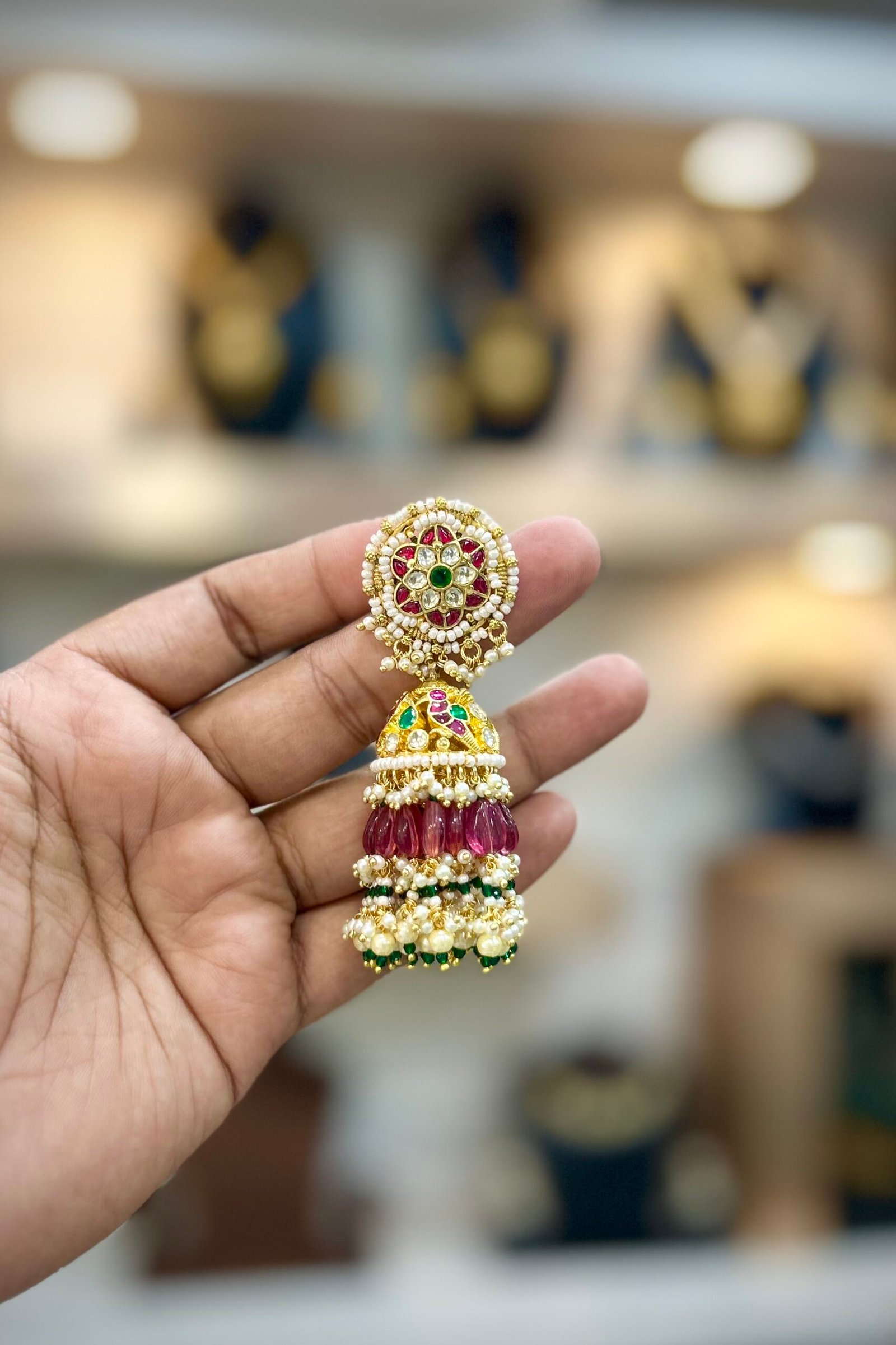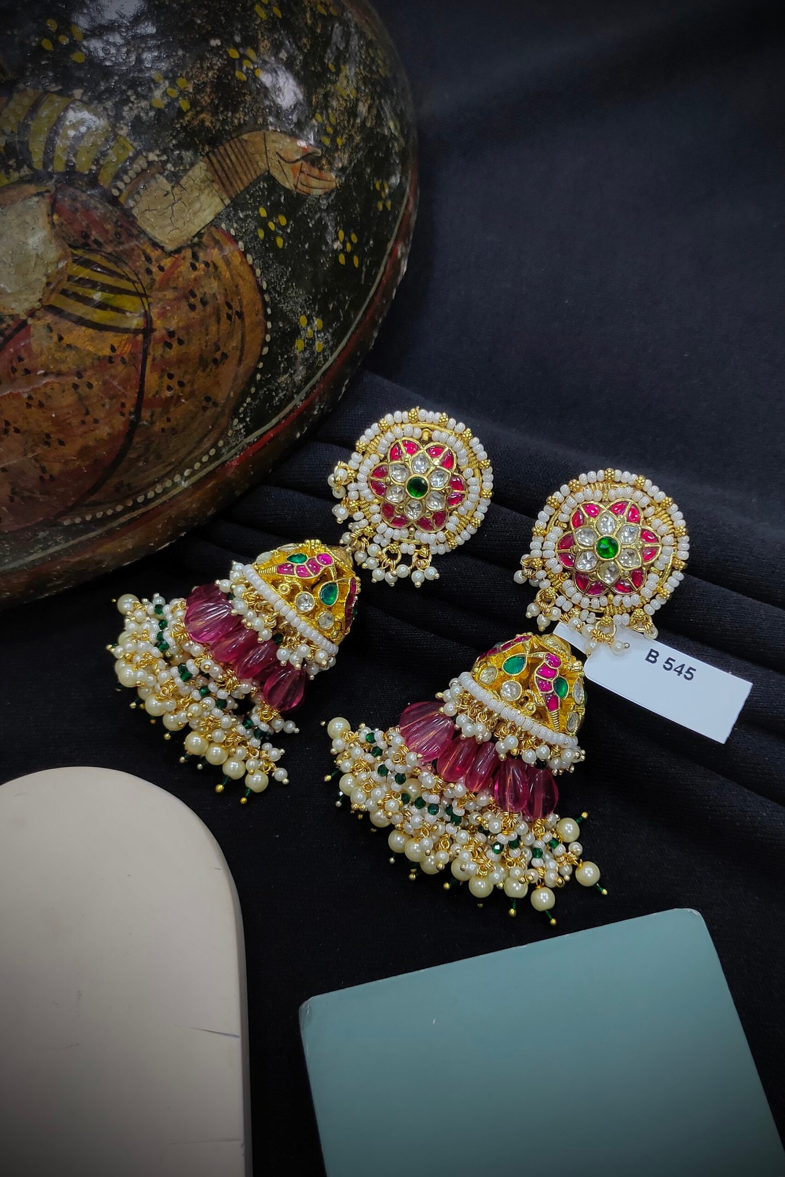 Elevate your ethnic charm with these exquisite Pachi Kundan Jhumka earrings. Handcrafted with traditional artistry, each piece features intricate Pachi Kundan work adorned with sparkling stones and delicate enamel detailing. The classic dome-shaped jhumka design adds timeless grace, making them perfect for weddings, festive occasions, or cultural celebrations.