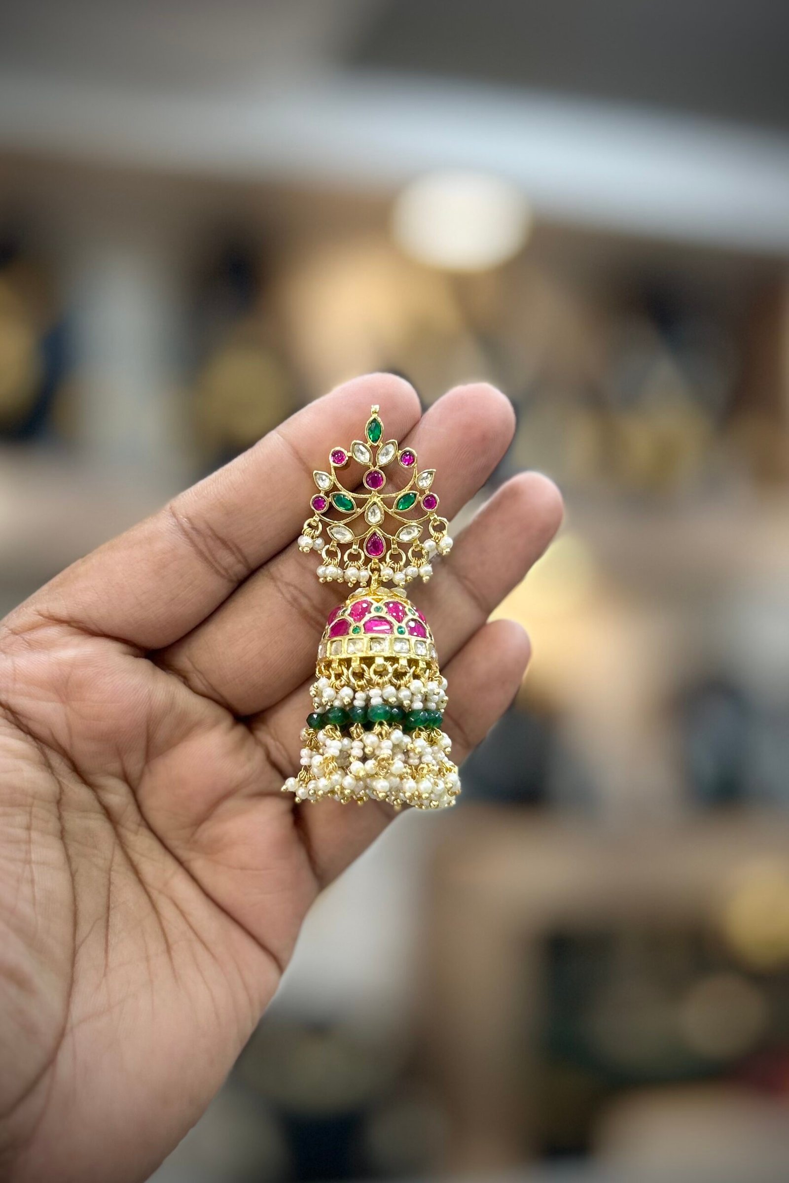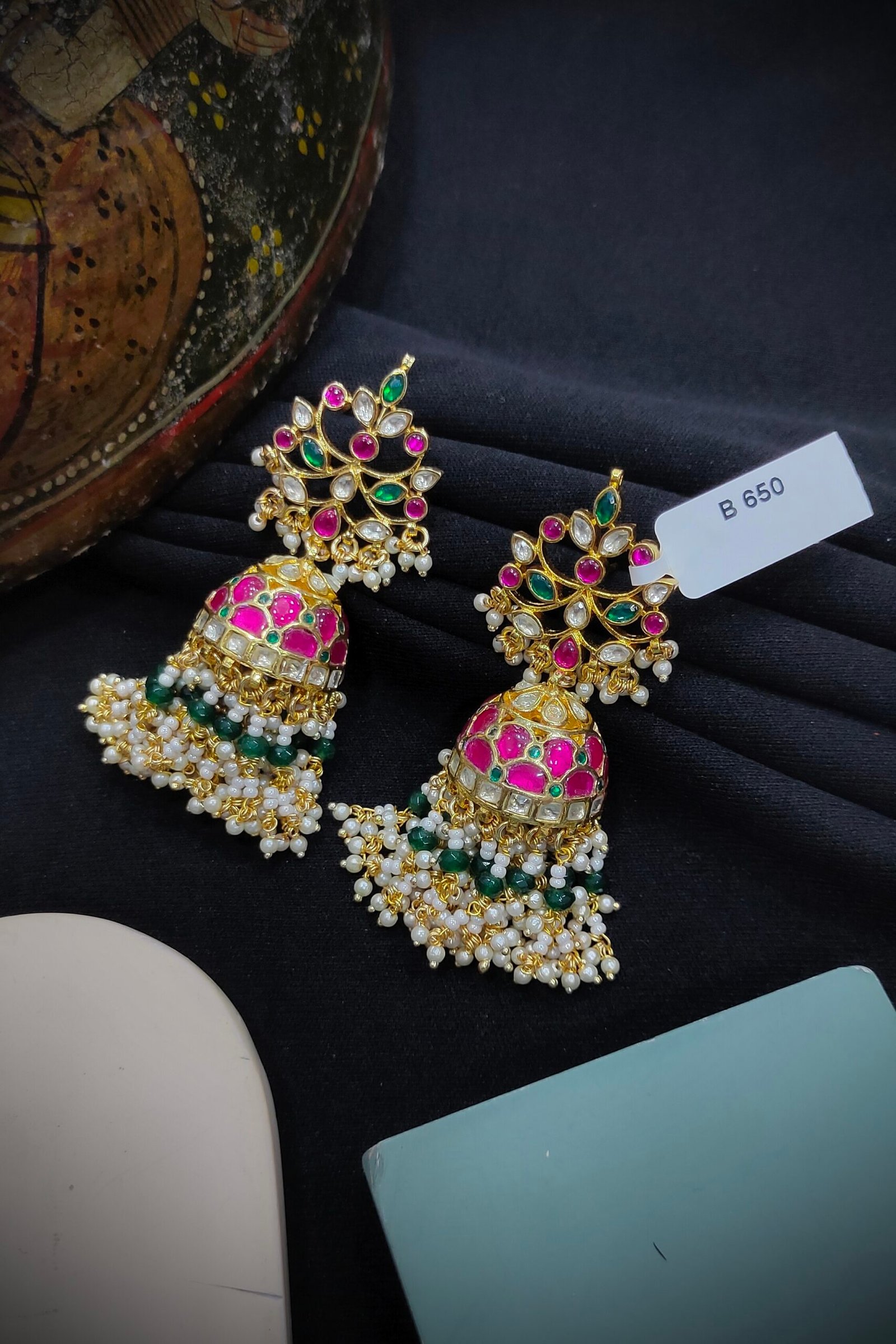 Elevate your ethnic charm with these exquisite Pachi Kundan Jhumka earrings. Handcrafted with traditional artistry, each piece features intricate Pachi Kundan work adorned with sparkling stones and delicate enamel detailing. The classic dome-shaped jhumka design adds timeless grace, making them perfect for weddings, festive occasions, or cultural celebrations.