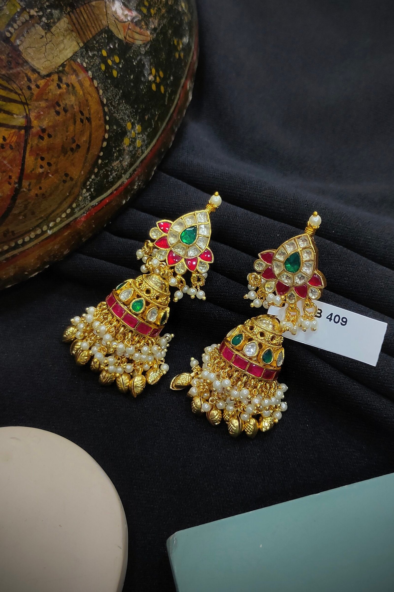 Elevate your ethnic charm with these exquisite Pachi Kundan Jhumka earrings. Handcrafted with traditional artistry, each piece features intricate Pachi Kundan work adorned with sparkling stones and delicate enamel detailing. The classic dome-shaped jhumka design adds timeless grace, making them perfect for weddings, festive occasions, or cultural celebrations.