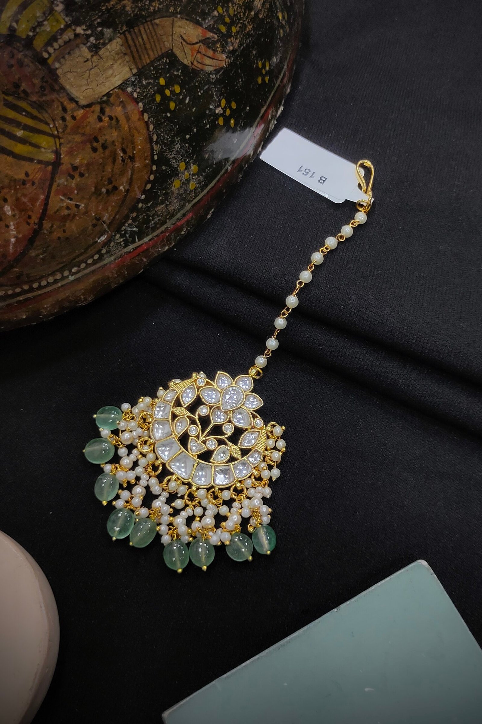 Explore our Pachi/Jadau Kundan MangTika, made from durable Brass and adorned with classic Rajwadi and Gold plating. This traditional piece adds a touch of timeless elegance to any outfit. Elevate your look with our Pachi/Jadau Kundan MangTika, a symbol of Indian heritage and sophistication.
