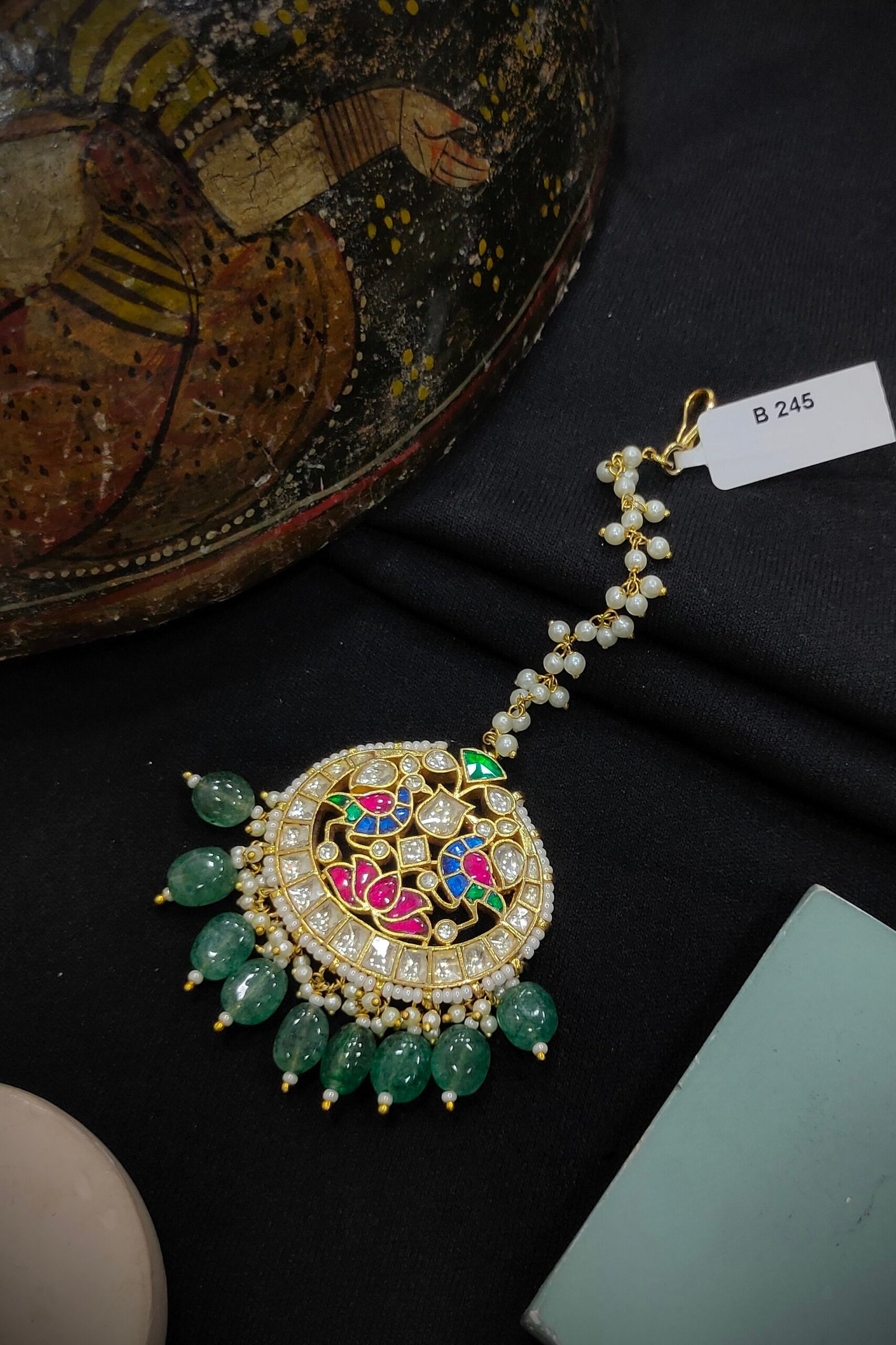 Explore our Pachi/Jadau Kundan MangTika, made from durable Brass and adorned with classic Rajwadi and Gold plating. This traditional piece adds a touch of timeless elegance to any outfit. Elevate your look with our Pachi/Jadau Kundan MangTika, a symbol of Indian heritage and sophistication.