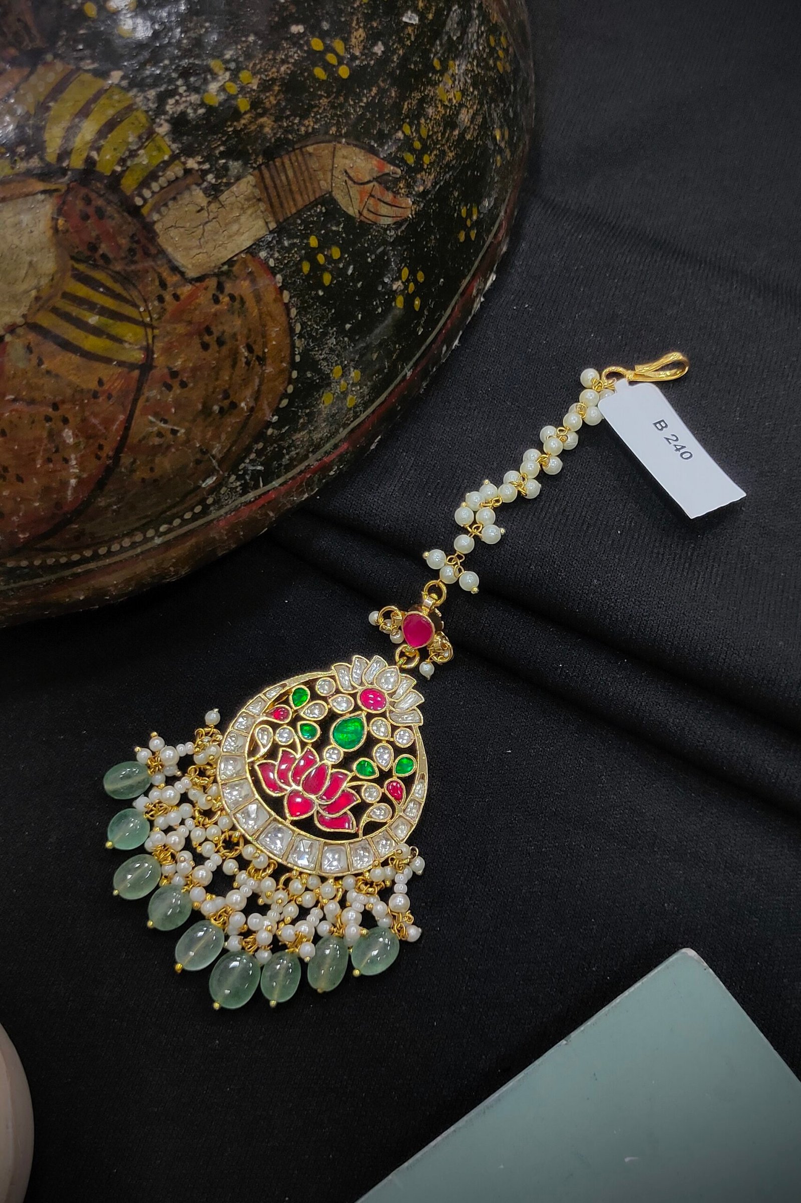 Explore our Pachi/Jadau Kundan MangTika, made from durable Brass and adorned with classic Rajwadi and Gold plating. This traditional piece adds a touch of timeless elegance to any outfit. Elevate your look with our Pachi/Jadau Kundan MangTika, a symbol of Indian heritage and sophistication.