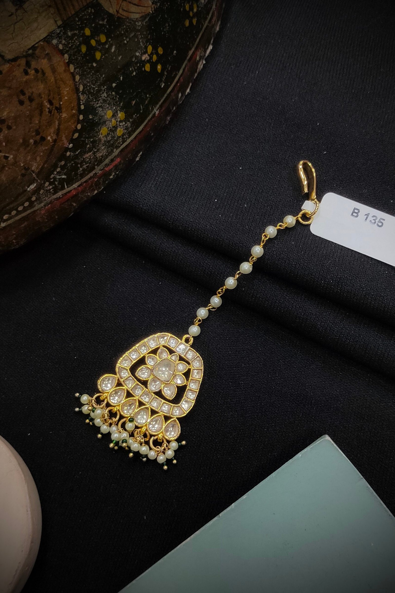 Explore our Pachi/Jadau Kundan MangTika, made from durable Brass and adorned with classic Rajwadi and Gold plating. This traditional piece adds a touch of timeless elegance to any outfit. Elevate your look with our Pachi/Jadau Kundan MangTika, a symbol of Indian heritage and sophistication.