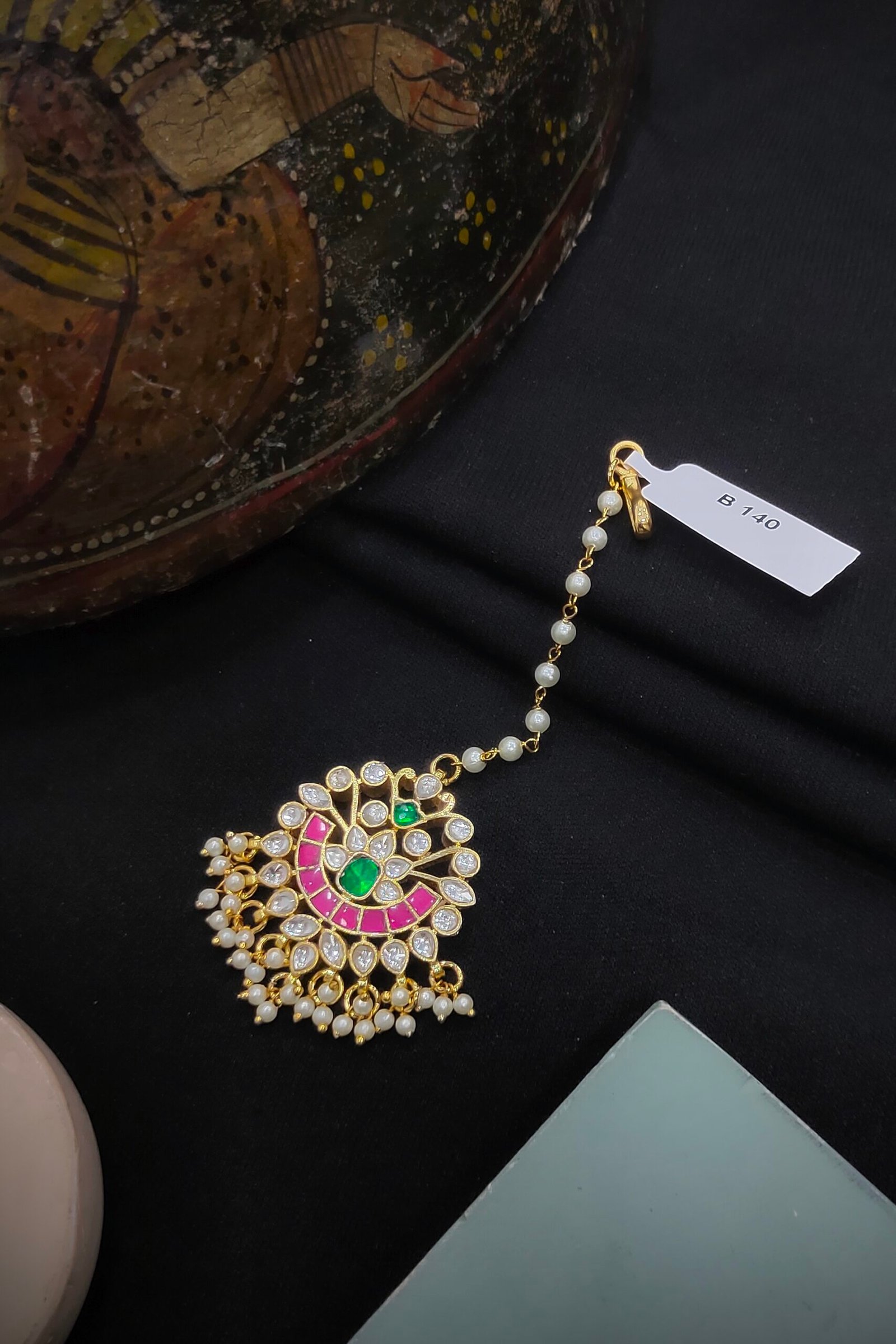 Explore our Pachi/Jadau Kundan MangTika, made from durable Brass and adorned with classic Rajwadi and Gold plating. This traditional piece adds a touch of timeless elegance to any outfit. Elevate your look with our Pachi/Jadau Kundan MangTika, a symbol of Indian heritage and sophistication.